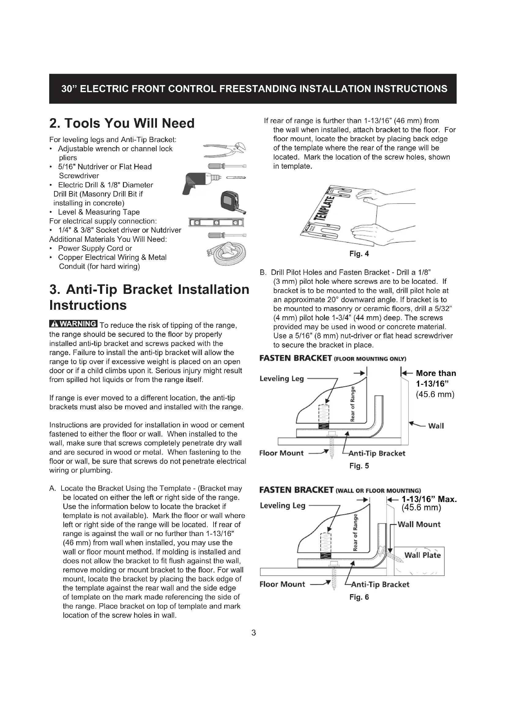 Instructions To reduce the risk of tipping of the range, the range should be secured to the oor by properly installed anti-tip bracket and screws packed with the range. Failure to install the anti-tip bracket will allow the range to tip over if excessive weight is placed on an open door or if a child climbs upon it. Serious injury might result from spilled hot liquids or from the range itself. If range is ever moved to a dierent location, the anti-tip brackets must also be moved and installed with the range. Instructions are provided for installation in wood or cement fastened to either the oor or wall. When installed to the wall, make sure that screws completely penetrate dry wall and are secured in wood or metal. When fastening to the oor or wall, be sure that screws do not penetrate electrical wiring or plumbing.A. Locate the Bracket Using the Template - (Bracket may be located on either the left or right side of the range. Use the information below to locate the bracket if template is not available). Mark the oor or wall where left or right side of the range will be located. If rear of range is against the wall or no further than 1-13/16" (46 mm) from wall when installed, you may use the wall or oor mount method. If molding is installed and does not allow the bracket to t ush against the wall, remove molding or mount bracket to the oor. For wall mount, locate the bracket by placing the back edge of the template against the rear wall and the side edge of template on the mark made referencing the side of the range. Place bracket on top of template and mark location of the screw holes in wall. For leveling legs and Anti-Tip Bracket:• Adjustable wrench or channel lock pliers• 5/16" Nutdriver or Flat Head Screwdriver• Electric Drill & 1/8" Diameter Drill Bit (Masonry Drill Bit if installing in concrete)• Level & Measuring TapeFor electrical supply connection:• 1/4" & 3/8" Socket driver or NutdriverAdditional Materials You Will Need:• Power Supply Cord or• Copper Electrical Wiring & Metal Conduit (for hard wiring) If rear of range is further than 1-13/16” (46 mm) from the wall when installed, attach bracket to the oor. For oor mount, locate the bracket by placing back edge of the template where the rear of the range will be located. Mark the location of the screw holes, shown in template.B. Drill Pilot Holes and Fasten Bracket - Drill a 1/8” (3 mm) pilot hole where screws are to be located. If bracket is to be mounted to the wall, drill pilot hole at an approximate 20° downward angle. If bracket is to be mounted to masonry or ceramic oors, drill a 5/32” (4 mm) pilot hole 1-3/4” (44 mm) deep. The screws provided may be used in wood or concrete material. Use a 5/16” (8 mm) nut-driver or at head screwdriver to secure the bracket in place. Fig. 4 Fig. 5 Fig. 6 (45.6 mm) 1-13/16” Max. (45.6 mm) More than 1-13/16”4