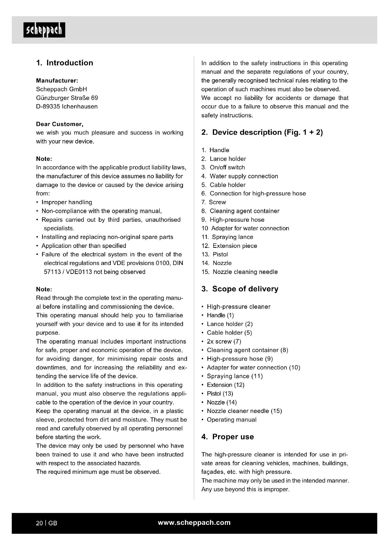 The high-pressure cleaner is intended for use in pri- vate areas for cleaning vehicles, machines, buildings, façades, etc. with high pressure. The machine may only be used in the intended manner. Any use beyond this is improper.www.scheppach.com