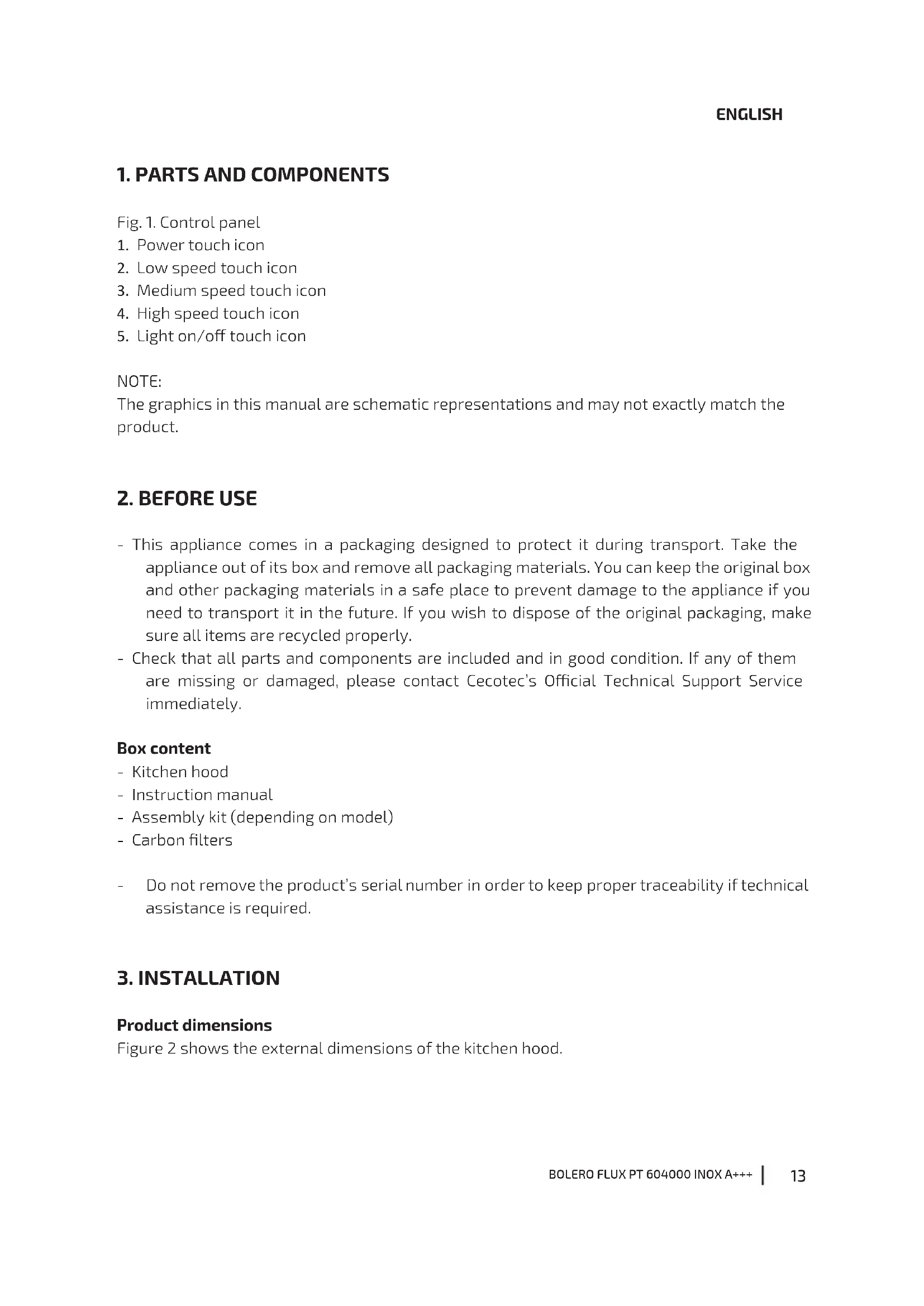 - This appliance comes in a packaging designed to protect it during transport. Take the appliance out of its box and remove all packaging materials. You can keep the original box and other packaging materials in a safe place to prevent damage to the appliance if you need to transport it in the future. If you wish to dispose of the original packaging, make sure all items are recycled properly. - Check that all parts and components are included and in good condition. If any of them are missing or damaged, please contact Cecotec’s Ocial Technical Support Service immediately. Box content - Kitchen hood - Instruction manual - Assembly kit (depending on model) - Carbon lters - Do not remove the product’s serial number in order to keep proper traceability if technical assistance is required.