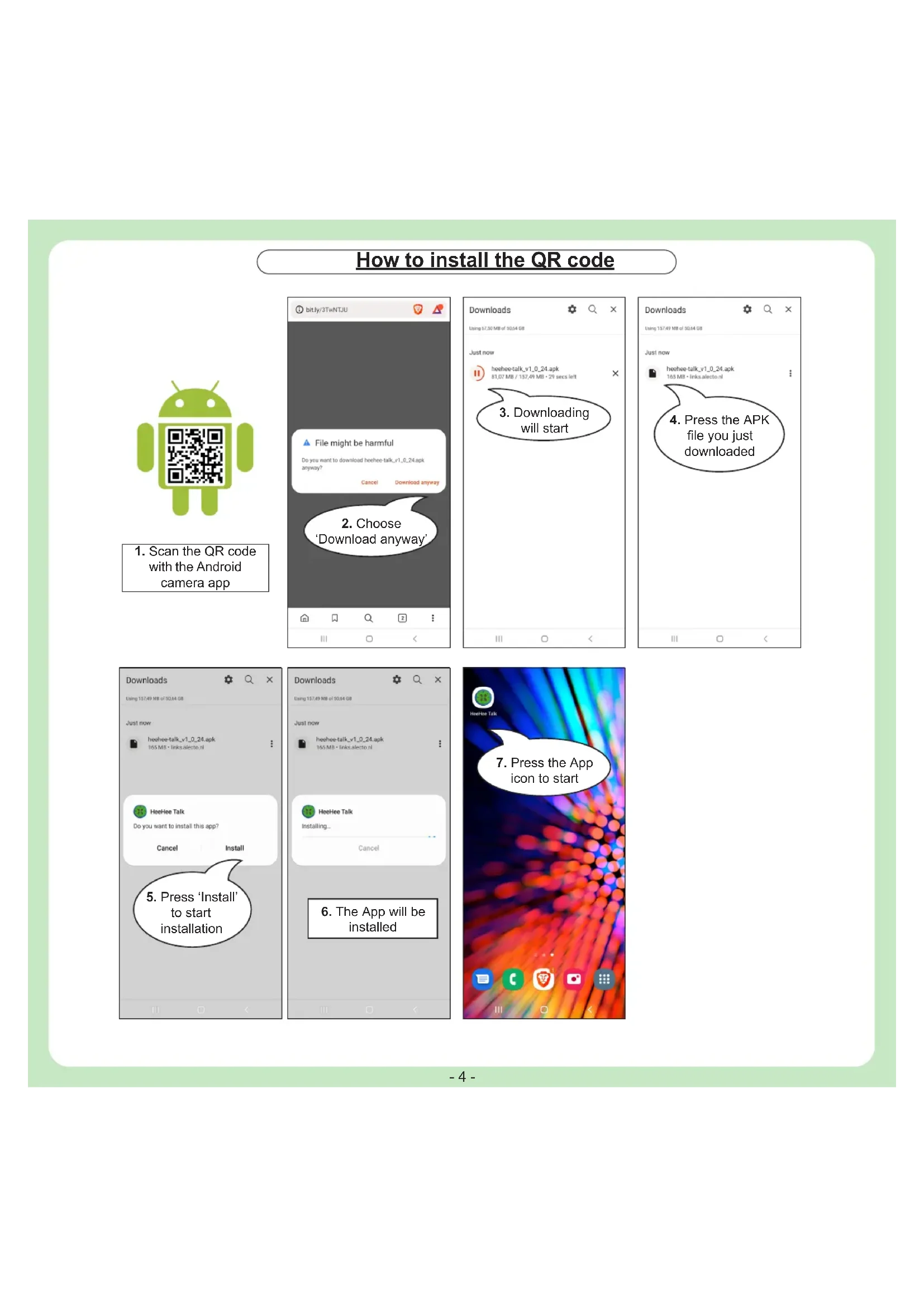 First open the HeeHee APP and click ‘OK’ in the pop-up. Turn on the HeeHee button by pressing the power button (see paragraph ‘5. Overview’) for 5 seconds. Android / iPhone users: In Bluetooth settings turn the Bluetooth ‘ON’ and select ‘HeeHee’ Note: Don’t select ‘Hee(BLE)’ If HeeHee does not want to connect with Bluetooth, only Hee(BLE) visible, then check if GPS location is ‘on’. CLICK HeeHee Talk Use the QR code to download the app and follow the instructions on page 3. Bluetooth Make sure the device you want to connect to is in pairing mode. Your phone (XXXX) is currently visible to nearby devices.Available devicesHee(BLE)HeeHeeXXXXXX