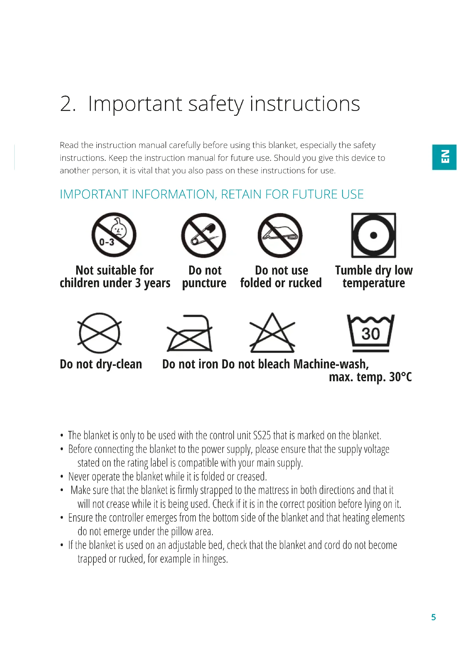 - The blanket is only to be used with the control unit SS25 that is marked on the blanket.