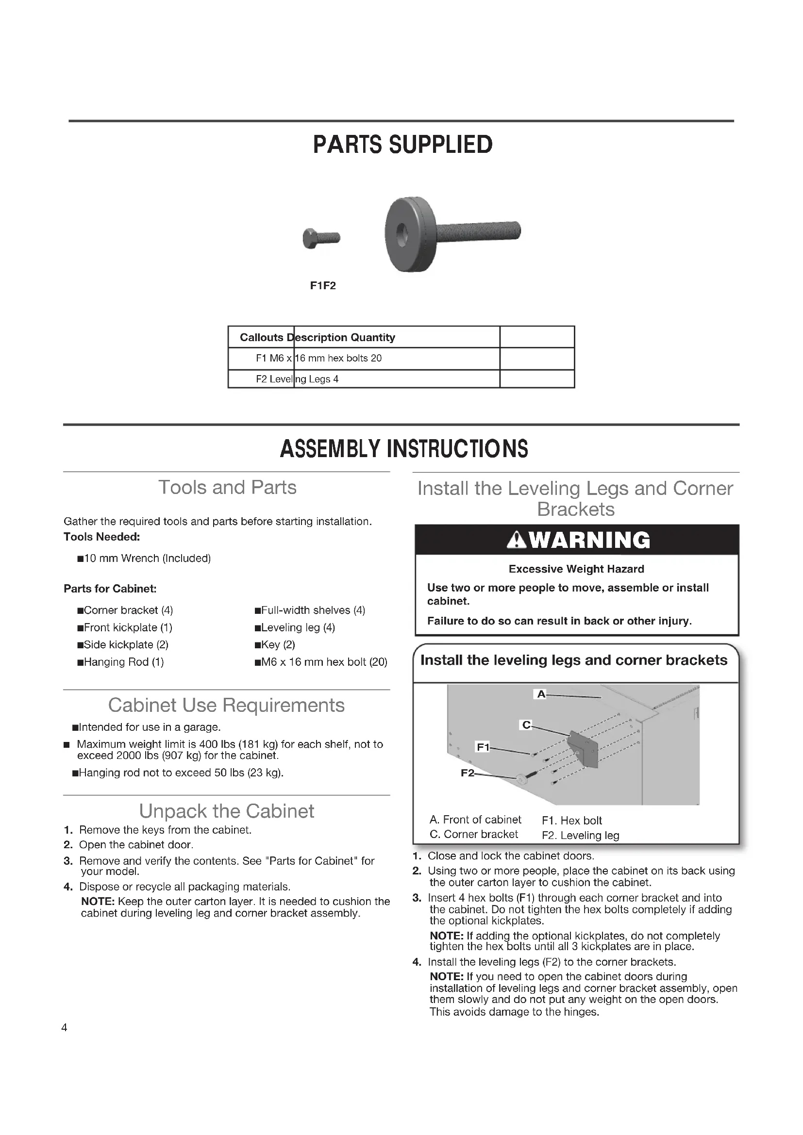 PARTS SUPPLIED Callouts Description QuantityF1 M6 x 16 mm hex bolts 20F2 Leveling Legs 4 ASSEMBLY INSTRUCTIONS Install the Leveling Legs and Corner Brackets WARNING Excessive Weight HazardUse two or more people to move, assemble or install cabinet.Failure to do so can result in back or other injury. Tools and Parts Gather the required tools and parts before starting installation.Tools Needed: ■ 10 mm Wrench (Included)Parts for Cabinet: ■ Corner bracket (4) ■ Front kickplate (1) ■ Side kickplate (2) ■ Hanging Rod (1) ■ Full-width shelves (4) ■ Leveling leg (4) ■ Key (2) ■ M6 x 16 mm hex bolt (20) Install the leveling legs and corner brackets 1 Close and lock the cabinet doors. 2 Using two or more people, place the cabinet on its back using the outer carton layer to cushion the cabinet. 3 Insert 4 hex bolts (F1) through each corner bracket and into the cabinet. Do not tighten the hex bolts completely if adding the optional kickplates. NOTE: If adding the optional kickplates, do not completely tighten the hex bolts until all 3 kickplates are in place.4 Install the leveling legs (F2) to the corner brackets.NOTE: If you need to open the cabinet doors during installation of leveling legs and corner bracket assembly, open them slowly and do not put any weight on the open doors. This avoids damage to the hinges. Cabinet Use Requirements ■ Intended for use in a garage. ■ Maximum weight limit is 400 lbs (181 kg) for each shelf, not to exceed 2000 lbs (907 kg) for the cabinet. ■ Hanging rod not to exceed 50 lbs (23 kg).F1 F2