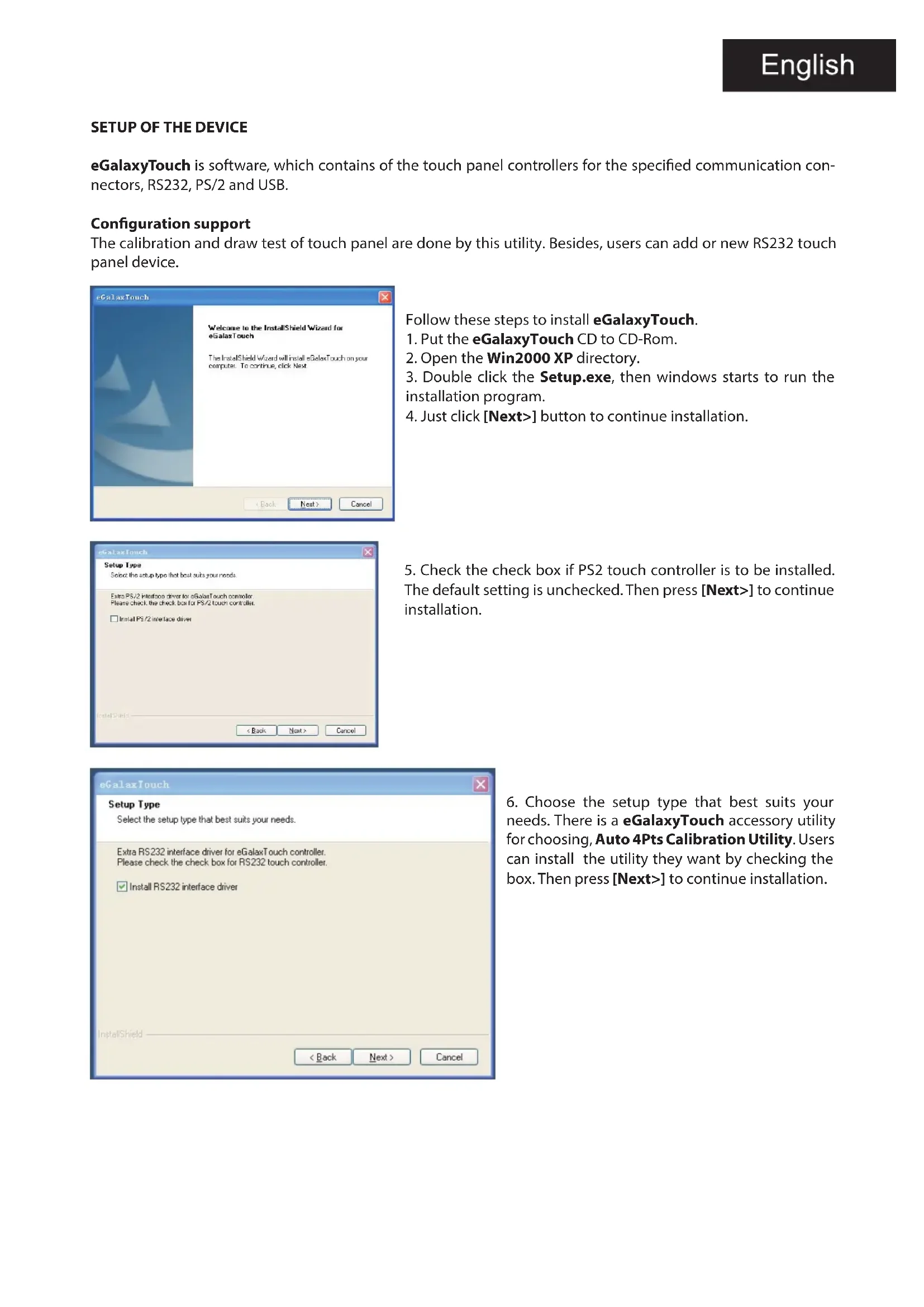 needs. There is a eGalaxyTouch accessory utility for choosing, Auto 4Pts Calibration Utility. Users can install the utility they want by checking the box. Then press [Next>] to continue installation.7. Please select 4 points calibration mode when system starts. Then press [Next>] to continue ins- tallation.