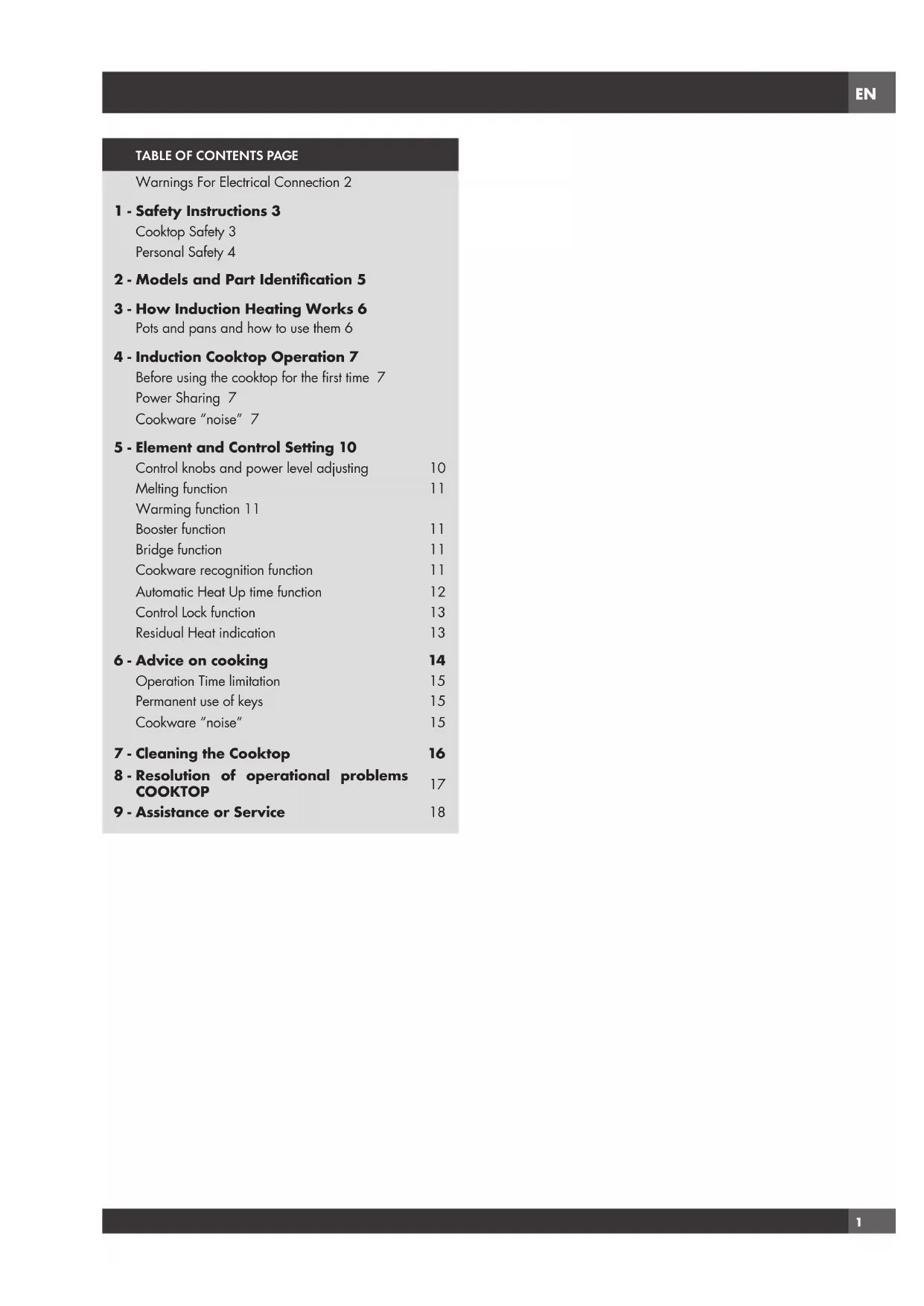 - Do not place metallic objects such as knives, forks, spoons, and lids on the cooktop surface since they can get hot.Do Not Cook on Broken Cook-Top• If cook-top should break, cleaning solutions and spillovers may penetrate the broken cooktop and create a risk of electric shock. Contact a qualified technician immediately.Clean Cook-Top With Caution• If a wet sponge or cloth is used to wipe spills on a hot cooking area, be careful to avoid steam burn. Some cleaners can produce noxious fumes if applied to a hot surface. IMPORTANT INSTRUCTION Please read all instructions before using this appliance.EN