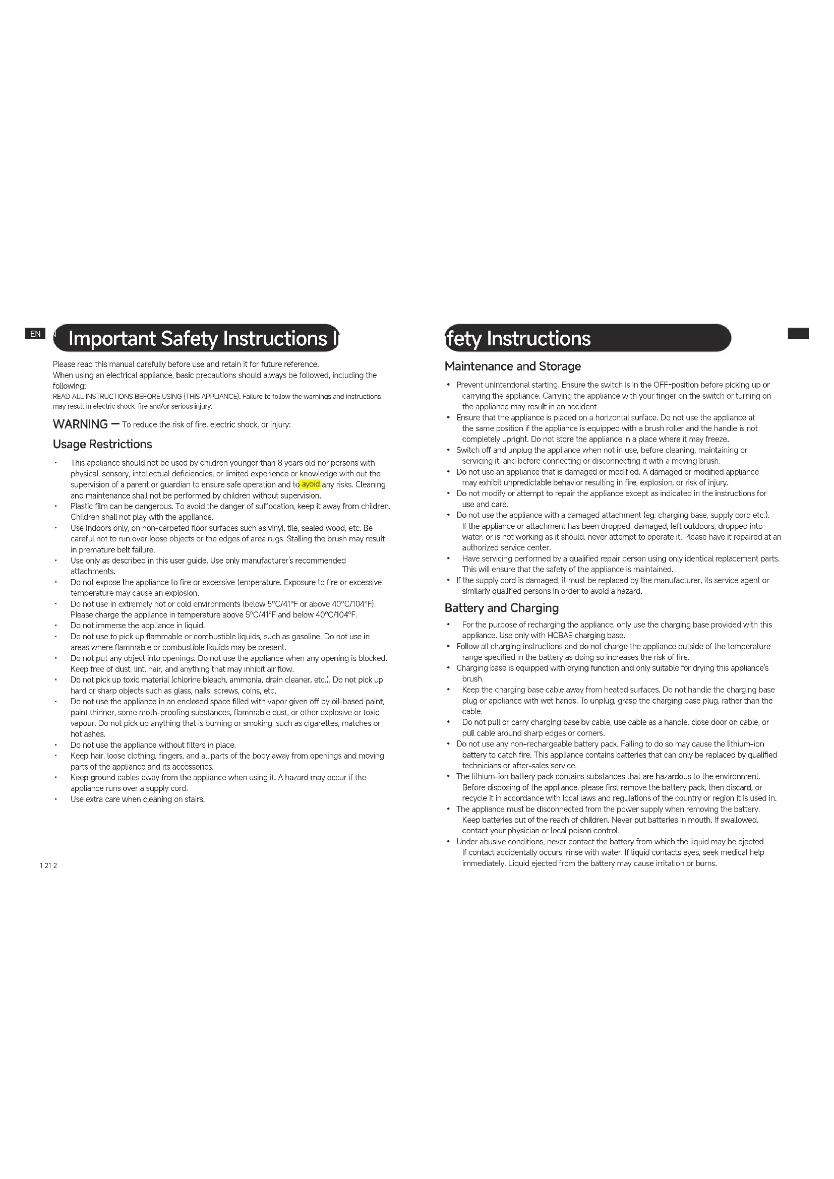 - If the appliance is not used for an extended period, fully charge it, unplugthe power plug, and store the appliance in a cool, low-humidity environment away from direct sunlight. To avoid over-discharge of the battery, charge the appliance at least once every 3 months. Care & Maintenance
