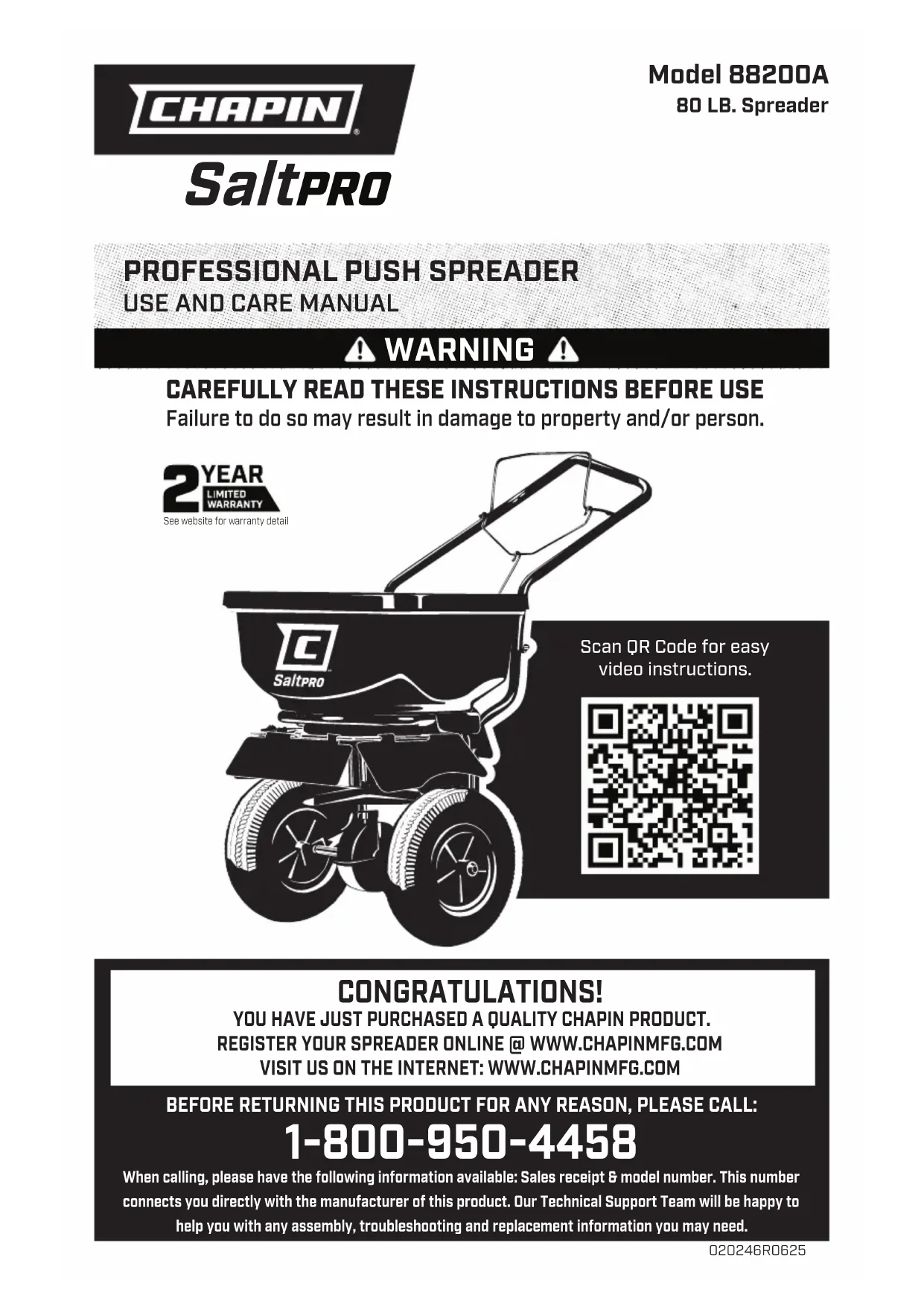 020246R0625BEFORE RETURNING THIS PRODUCT FOR ANY REASON, PLEASE CALL: 1-800-950-4458 When calling, please have the following information available: Sales receipt & model number. This number connects you directly with the manufacturer of this product. Our Technical Support Team will be happy to help you with any assembly, troubleshooting and replacement information you may need. CONGRATULATIONS! YOU HAVE JUST PURCHASED A QUALITY CHAPIN PRODUCT.REGISTER YOUR SPREADER ONLINE @ WWW.CHAPINMFG.COMVISIT US ON THE INTERNET: WWW.CHAPINMFG.COM 80 LB. Spreader