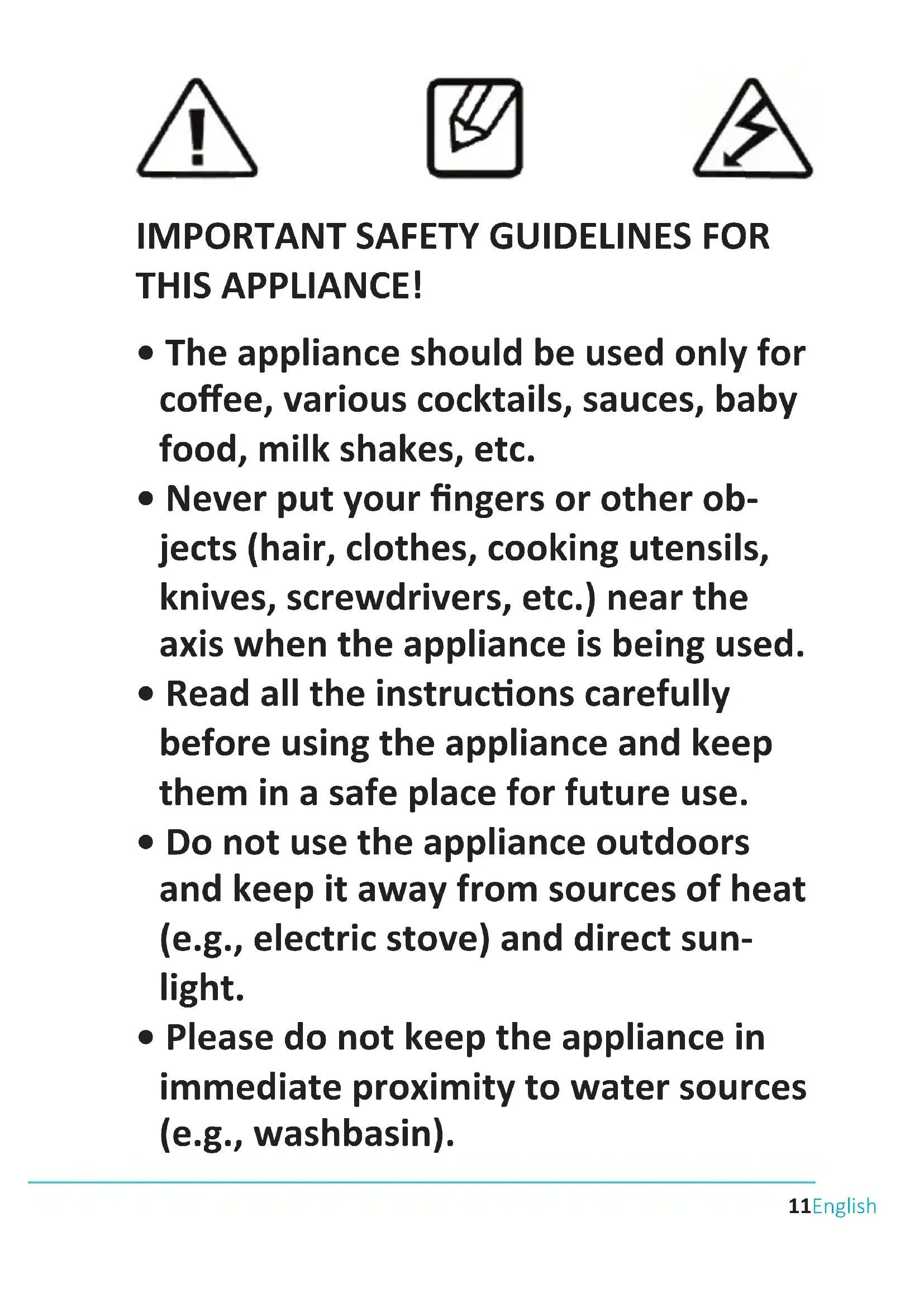 - The appliance should be used only for coee, various cocktails, sauces, baby food, milk shakes, etc.