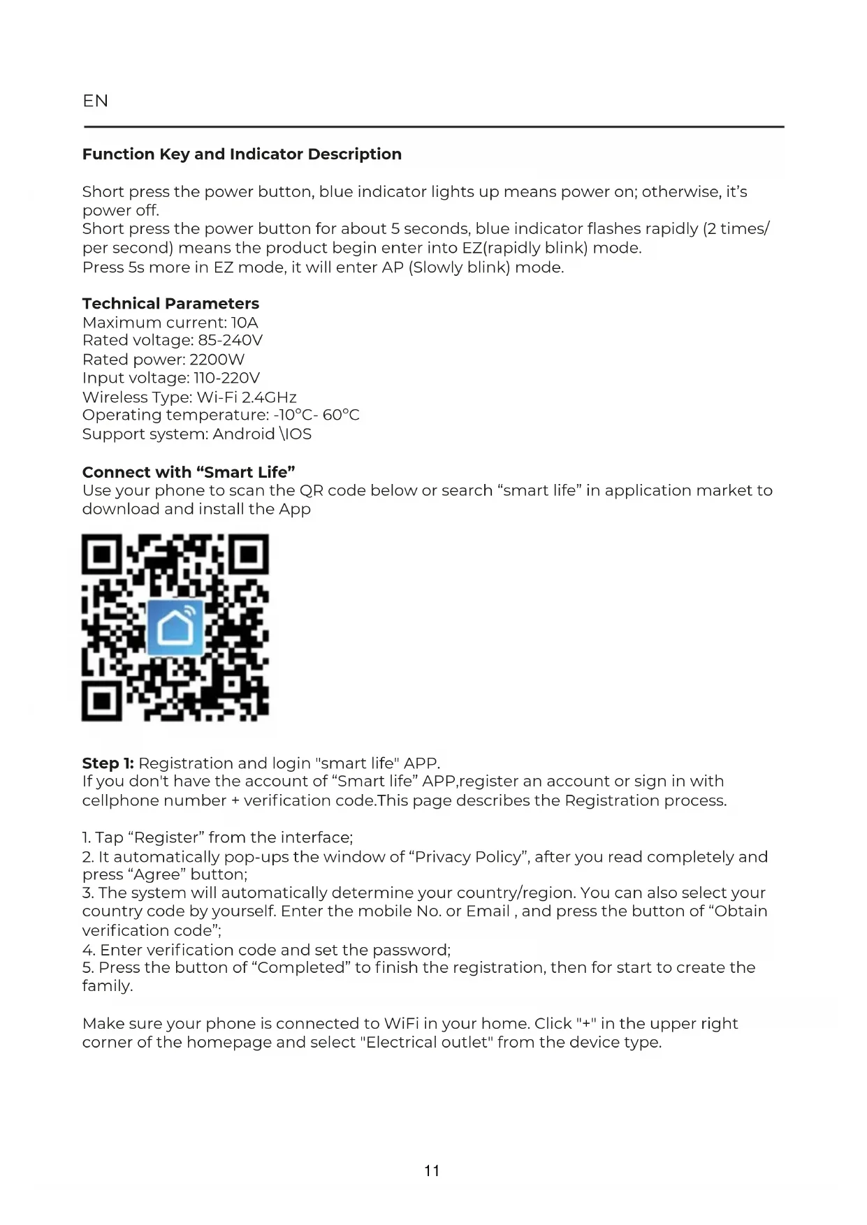 family. Make sure your phone is connected to WiFi in your home. Click "+" in the upper right corner of the homepage and select "Electrical outlet" from the device type. Function Key and Indicator Description Short press the power button, blue indicator lights up means power on; otherwise, it’s power off. Short press the power button for about 5 seconds, blue indicator flashes rapidly (2 times/ per second) means the product begin enter into EZ(rapidly blink) mode. Press 5s more in EZ mode, it will enter AP (Slowly blink) mode. Technical Parameters Maximum current: 10A Rated voltage: 85-240V Rated power: 2200W Input voltage: 110-220V Wireless Type: Wi-Fi 2.4GHz Operating temperature: -10ºC- 60ºC Support system: Android \IOS Connect with “Smart Life” Use your phone to scan the QR code below or search “smart life” in application market to download and install the App 11Step 2: Connect with the power supply, long press the power button more than 5 seconds until the blue indicator enters into the fast flash mode. Select and press the button of “confirm indicator rapidly blink ”. Step 3: Enter your WiFi password for your phone and click "Confirm" to enter the page of the search device. 12While under AP mode, press the button” Confirm indicator slowly blink”, and input the WiFi password to complete the connecting. Step 4: Enter the device page, then complete the configuration 13Take use of Statistic Function: Click the icon of “statistics” at the lower right corner ,it will enter the interface of “Electrical Quality Management”. Check the current detailed data. How to use Amazon Echo to control your Smart devices? Step 1: Open the” Amazon Alexa”APP,then find the “Skills “button on the menu. Press it. 14Step 3: Select your country code and Enter your “Smart life” APP Account and Password, then press the “Link Now” button. When the Account success to login press the “Done” button. Step 2: Search the” Smart life” and choose the first one, then Enable it. 15Step 5: Now you can use your Alexa to control your Smart devices, enjoy yourself. How to connect with Google Home?