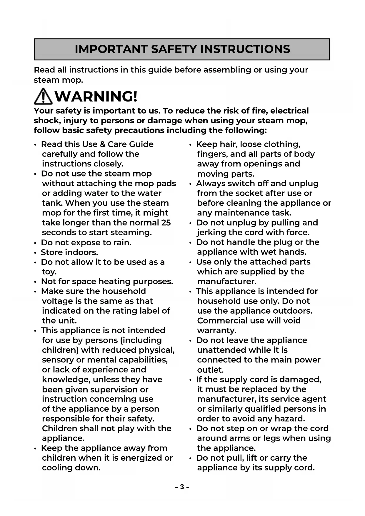2 Striped Cotton Mop Pads 1 Measuring Cup 1 Use & Care Guide- 3 - WARNING! Your safety is important to us. To reduce the risk of re, electrical shock, injury to persons or damage when using your steam mop, follow basic safety precautions including the following: