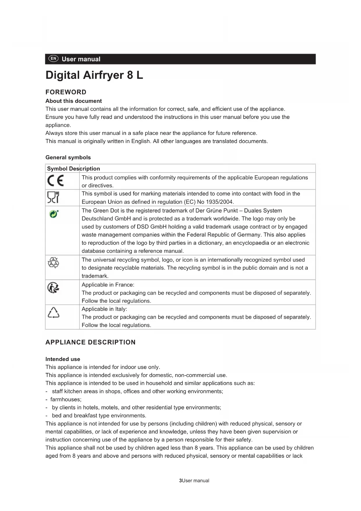 User manual Digital Airfryer 8 L FOREWORD About this document This user manual contains all the information for correct, safe, and efficient use of the appliance. Ensure you have fully read and understood the instructions in this user manual before you use the appliance. Always store this user manual in a safe place near the appliance for future reference. This manual is originally written in English. All other languages are translated documents. General symbols Symbol Description This product complies with conformity requirements of the applicable European regulations or directives. This symbol is used for marking materials intended to come into contact with food in the European Union as dened in regulation (EC) No 1935/2004. The Green Dot is the registered trademark of Der Grüne Punkt – Duales System Deutschland GmbH and is protected as a trademark worldwide. The logo may only be used by customers of DSD GmbH holding a valid trademark usage contract or by engaged waste management companies within the Federal Republic of Germany. This also applies to reproduction of the logo by third parties in a dictionary, an encyclopaedia or an electronic database containing a reference manual. The universal recycling symbol, logo, or icon is an internationally recognized symbol used to designate recyclable materials. The recycling symbol is in the public domain and is not a trademark. Applicable in France: The product or packaging can be recycled and components must be disposed of separately. Follow the local regulations. Applicable in Italy: The product or packaging can be recycled and components must be disposed of separately. Follow the local regulations. APPLIANCE DESCRIPTION Intended use This appliance is intended for indoor use only. This appliance is intended exclusively for domestic, non-commercial use. This appliance is intended to be used in household and similar applications such as: - staff kitchen areas in shops, offices and other working environments; - farm houses; - by clients in hotels, motels, and other residential type environments; - bed and breakfast type environments. This appliance is not intended for use by persons (including children) with reduced physical, sensory or mental capabilities, or lack of experience and knowledge, unless they have been given supervision or instruction concerning use of the appliance by a person responsible for their safety. This appliance shall not be used by children aged less than 8 years. This appliance can be used by children aged from 8 years and above and persons with reduced physical, sensory or mental capabilities or lack4Tristar Europe B.V. | Digital Airfryer 8 L | FR-9418 of experience and knowledge if they have been given supervision or instruction concerning use of the appliance in a safe way and understand the hazards involved. Children shall not play with the appliance. Keep the appliance and its cord out of reach of children aged less than 8 years. Cleaning and user maintenance shall not be made by children unless older than 8 and supervised. The appliance is not intended to be operated by means of an external timer or a separate remote-control system. Any use of the appliance other than described in this user manual is regarded as misuse and may cause injury or damage to the appliance and void the warranty. Technical specications Appliance name Digital Airfryer 8 L Article number FR-9418 Power supply 220-240V ~ 50-60Hz Power consumption in use 2000 W Main parts (see image A)