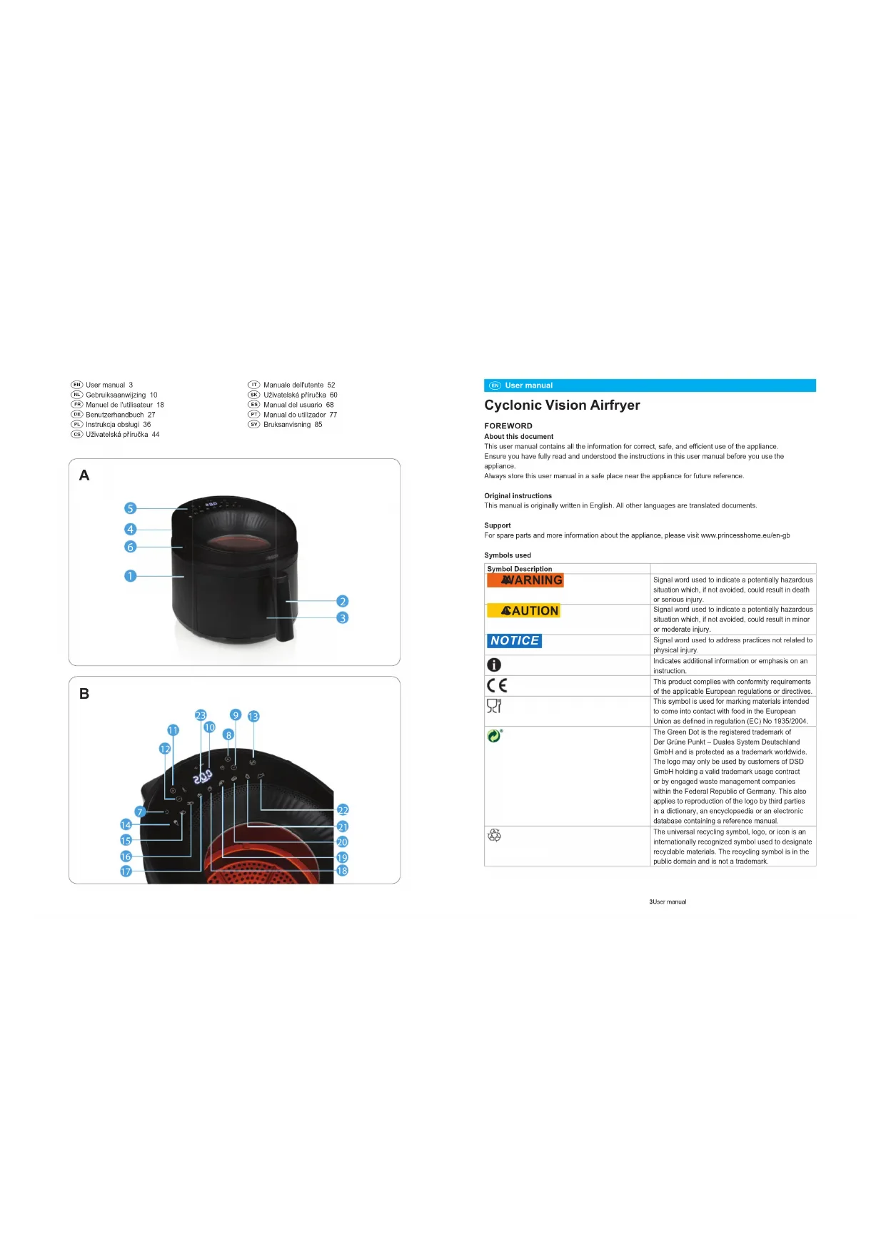 User manual Cyclonic Vision Airfryer FOREWORDAbout this documentThis user manual contains all the information for correct, safe, and efficient use of the appliance.Ensure you have fully read and understood the instructions in this user manual before you use the appliance.Always store this user manual in a safe place near the appliance for future reference.Original instructionsThis manual is originally written in English. All other languages are translated documents.SupportFor spare parts and more information about the appliance, please visit www.princesshome.eu/en-gbSymbols usedSymbol Description 6 WARNING Signal word used to indicate a potentially hazardous situation which, if not avoided, could result in death or serious injury. 6 CAUTION Signal word used to indicate a potentially hazardous situation which, if not avoided, could result in minor or moderate injury. NOTICE Signal word used to address practices not related to physical injury.Indicates additional information or emphasis on an instruction.This product complies with conformity requirements of the applicable European regulations or directives.This symbol is used for marking materials intended to come into contact with food in the European Union as dened in regulation (EC) No 1935/2004.The Green Dot is the registered trademark of Der Grüne Punkt – Duales System Deutschland GmbH and is protected as a trademark worldwide. The logo may only be used by customers of DSD GmbH holding a valid trademark usage contract or by engaged waste management companies within the Federal Republic of Germany. This also applies to reproduction of the logo by third parties in a dictionary, an encyclopaedia or an electronic database containing a reference manual.The universal recycling symbol, logo, or icon is an internationally recognized symbol used to designate recyclable materials. The recycling symbol is in the public domain and is not a trademark.4 5© Princess 2023 | Cyclonic Vision Airfryer | 01.182270.01.001 User manual Applicable in France: The product or packaging can be recycled and components must be disposed of separately. Follow the local regulations. Applicable in Italy: The product or packaging can be recycled and components must be disposed of separately. Follow the local regulations. Waste electrical products should not be disposed of with household waste. Please recycle where facilities exist. Check with your local authority or local store for recycling advice. APPLIANCE DESCRIPTION About this appliance The Princess 01.182270.01.001 is an air fryer for grilling, baking, and roasting food using hot air without the use of oil. Intended use This appliance is intended for indoor use only. This appliance is intended exclusively for domestic, non-commercial use. This appliance is intended to be used in household and similar applications such as: - staff kitchen areas in shops, offices and other working environments; - farm houses; - by clients in hotels, motels, and other residential type environments; - bed and breakfast type environments. This appliance is not intended for use by persons (including children) with reduced physical, sensory or mental capabilities, or lack of experience and knowledge, unless they have been given supervision or instruction concerning use of the appliance by a person responsible for their safety. This appliance shall not be used by children aged less than 8 years. This appliance can be used by children aged from 8 years and above and persons with reduced physical, sensory or mental capabilities or lack of experience and knowledge if they have been given supervision or instruction concerning use of the appliance in a safe way and understand the hazards involved. Children shall not play with the appliance. Keep the appliance and its cord out of reach of children aged less than 8 years. Cleaning and user maintenance shall not be made by children unless older than 8 and supervised. The appliance is not intended to be operated by means of an external timer or a separate remote-control system. Any use of the appliance other than described in this user manual is regarded as misuse and may cause injury or damage to the appliance and void the warranty. Technical specications Appliance name Digital Aerofryer Article number 01.182270.01.001 Power supply 220 – 240 V~ 50/60Hz Power consumption in use 1500 W Main parts (see image A)