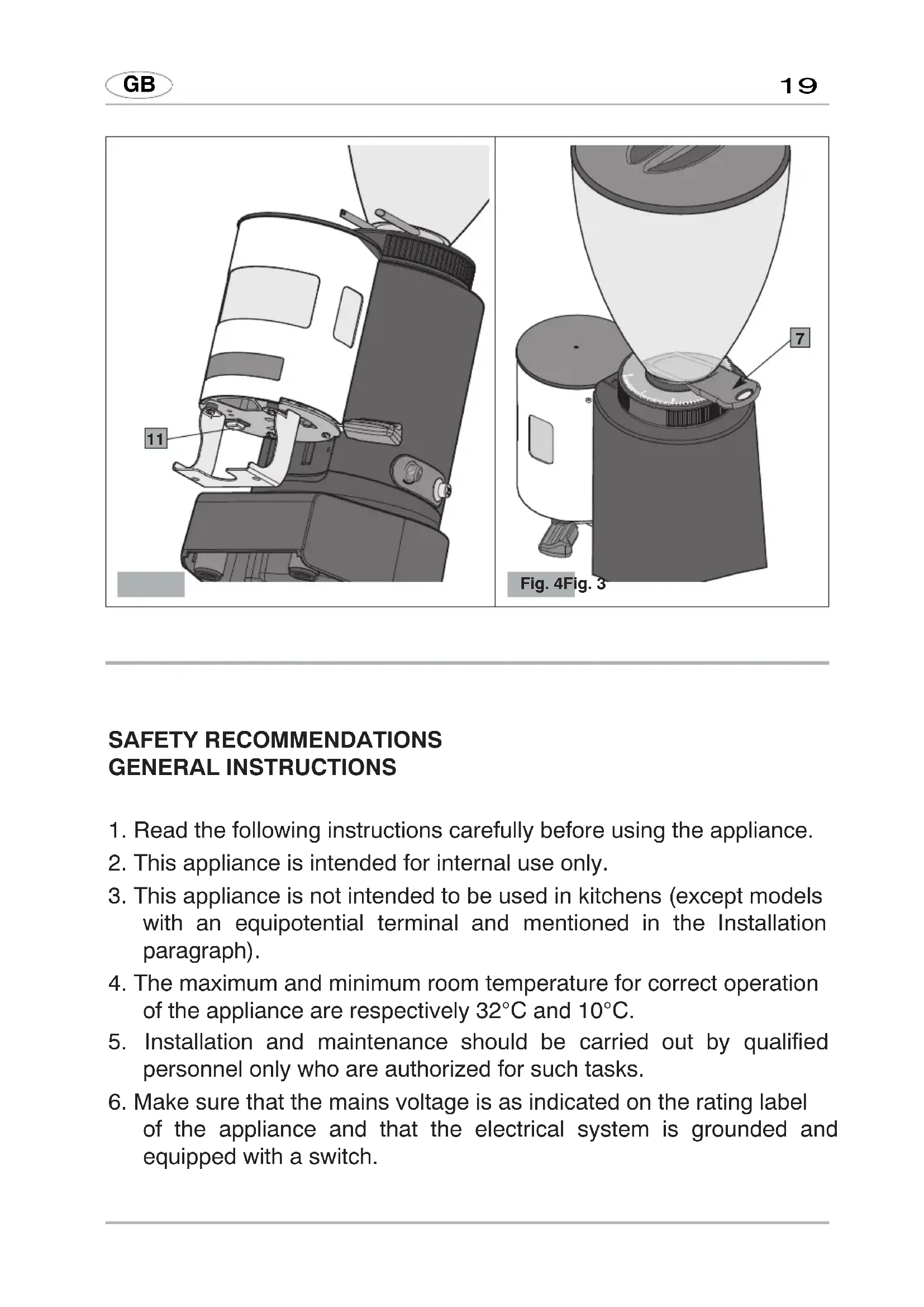 Before first use: rinse all of the parts that will have contact with food in running water i.e.: bean hopper, lid, shutter, doser, tray. SWITCHING ON Fill the hopper with coffee beans and close the lid. Be sure to keep the lid of the doser unit closed during operation of the appliance. Turn the ON-OFF switch to position “1”. Manual model The appliance will start working and must be stopped by the operator by means of the ON-OFF switch once the desired amount of coffee has been obtained. Automatic model Press the start button (11 Fig. 3). The appliance will start working, grinding a sufficient amount of beans to fill the doser up to its maximum level which considers a capacity of about 300 g of ground coffee; once this has been reached, a switch stops the motor. Further coffee grinding will resume automatically after six doses of ground coffee have been extracted. Timed model Set the desired operating time (5-60 seconds) using the setting knob (15 Fig. 2) and press the start button (11 Fig. 3). The appliance will begin to work and will stop automatically after the set time.
