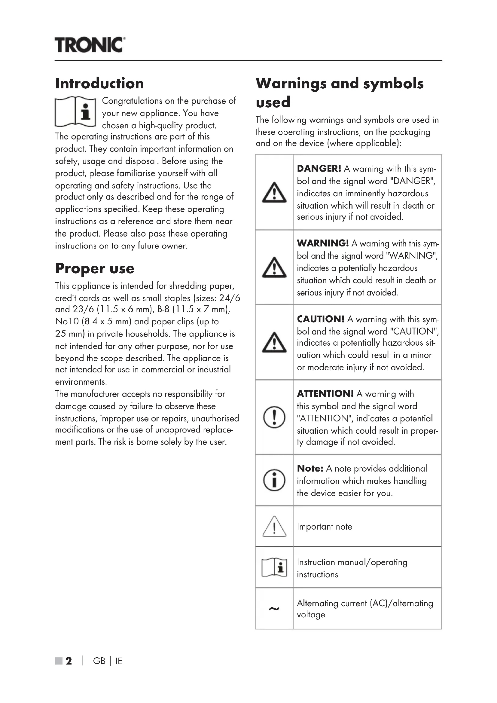 Introduction Congratulations on the purchase of your new appliance. You have chosen a high-quality product. The operating instructions are part of this product. They contain important information on safety, usage and disposal. Before using the product, please familiarise yourself with all operating and safety instructions. Use the product only as described and for the range of applications specified. Keep these operating instructions as a reference and store them near the product. Please also pass these operating instructions on to any future owner. Proper use This appliance is intended for shredding paper, credit cards as well as small staples (sizes: 24/6 and 23/6 (11.5 x 6 mm), B-8 (11.5 x 7 mm), No10 (8.4 x 5 mm) and paper clips (up to 25mm) in private households. The appliance is not intended for any other purpose, nor for use beyond the scope described. The appliance is not intended for use in commercial or industrial environments. The manufacturer accepts no responsibility for damage caused by failure to observe these instructions, improper use or repairs, unauthorised modifications or the use of unapproved replace- ment parts. The risk is borne solely by the user. Warnings and symbols used The following warnings and symbols are used in these operating instructions, on the packaging and on the device (where applicable): DANGER! A warning with this sym- bol and the signal word "DANGER", indicates an imminently hazardous situation which will result in death or serious injury if not avoided. WARNING! A warning with this sym- bol and the signal word "WARNING", indicates a potentially hazardous situation which could result in death or serious injury if not avoided