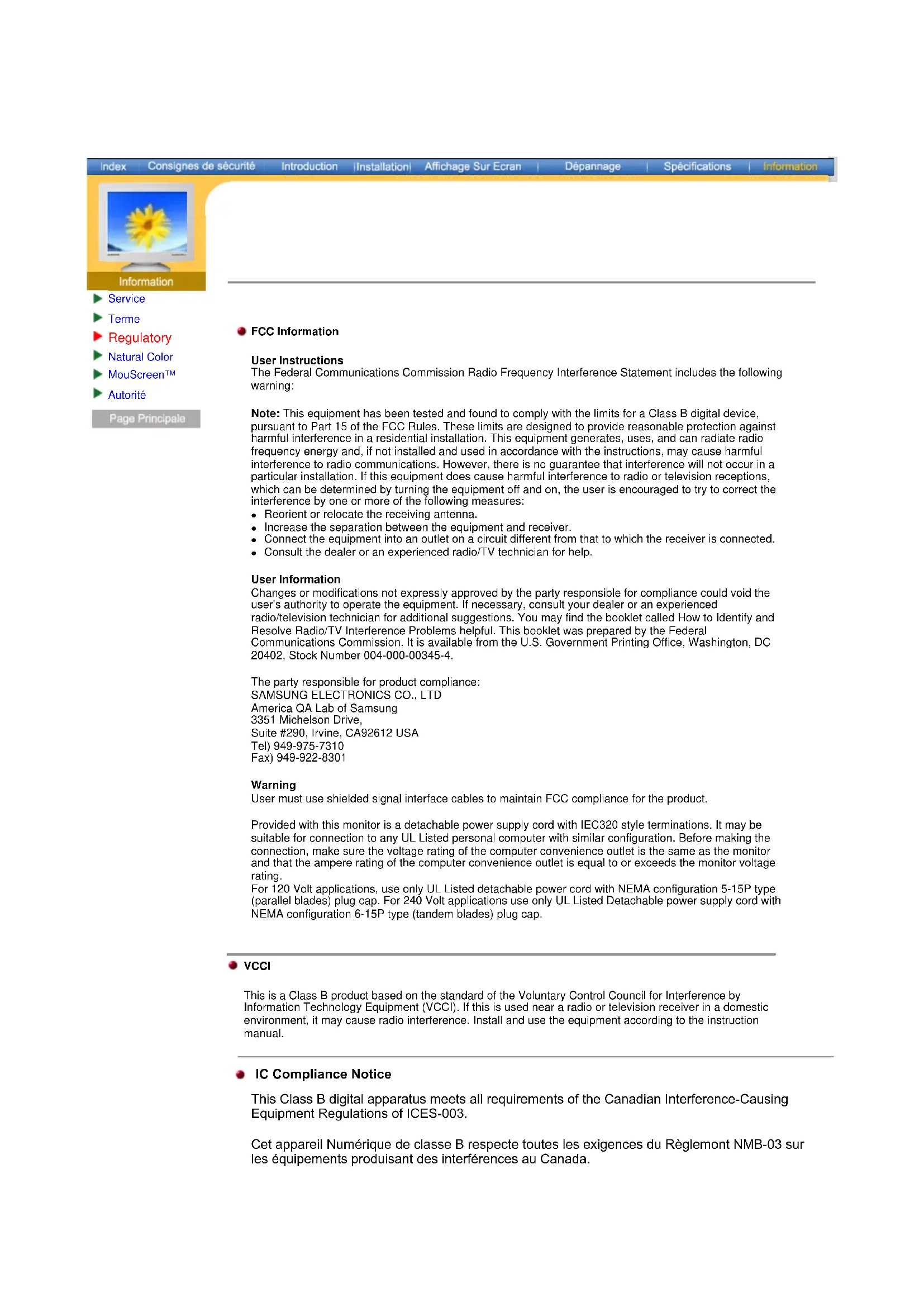 America QA Lab of Samsung 3351 Michelson Drive, Suite #290, Irvine, CA92612 USA Tel) 949-975-7310 Fax) 949-922-8301 Warning User must use shielded signal interface cables to maintain FCC compliance for the product. Provided with this monitor is a detachable power supply cord with IEC320 style terminations. It may be suitable for connection to any UL Listed personal computer with similar configuration. Before making the connection, make sure the voltage rating of the computer convenience outlet is the same as the monitor and that the ampere rating of the computer convenience outlet is equal to or exceeds the monitor voltage rating. For 120 Volt applications, use only UL Listed detachable power cord with NEMA configuration 5-15P type (parallel blades) plug cap. For 240 Volt applications use only UL Listed Detachable power supply cord with NEMA configuration 6-15P type (tandem blades) plug cap. VCCI This is a Class B product based on the standard of the Voluntary Control Council for Interference by Information Technology Equipment (VCCI). If this is used near a radio or television receiver in a domestic environment, it may cause radio interference. Install and use the equipment according to the instruction manual. This Class B digital apparatus meets all requirements of the Canadian Interference-Causing Equipment Regulations of ICES-003. Cet appareil Numérique de classe B respecte toutes les exigences du Règlemont NMB-03 sur les équipements produisant des interférences au Canada. IC Compliance NoticeMPR II Compliance This monitor complies with SWEDAC(MPR II) recommendations for reduced electric and magnetic fields. PCT Notice TCO'95-Ecological requirements for personal computers (TCO applied model only) AB general requirements AB2 Written Eco-document acompanying the products Congratulations! You have just purchased a TCO'95 approved and labelled product! Your choice has provided you with a product developed for professional use. Your purchase has also contributed to reducing the burden on the environment and to the further development of environmentally-adapted electronic products. Why do we have environmentally-labelled monitors? In many countries, environmental labelling has become an established method for encouraging the adaptation of goods and services to the environment.The main problem as far as monitors and other electronic equipment are concerned is that environmentally harmful substances are used both in the products and during their manufacture. Since it has not been possible so far for the majority of electronic equipment to be recycled in a satisfactory way, most of these potentially damaging substances sooner or later enter Nature. There are also other characteristics of a monitor, such as energy consumption levels, that are important from both the working and natural environment viewpoints. Since all types of conventional electricity generation have a negative effect on the environment (acidic and climate- influencing emissions, radioactive waste, etc.) it is vital to conserve energy. Electronic equipment in offices consumes an enormous amount of energy, since it is often routinely left running continuously. What does labelling involve? This product meets the requirements for the TCO'95 scheme, which provides for international environmental labelling of monitors. The labelling scheme was developed as a joint effort by the TCO (The Swedish Confederation of Professional Employees), Naturskyddsforeningen (The Swedish Society for Nature Conservation) and NUTEK (The National Board for Industrial and Technical Development in Sweden). The re