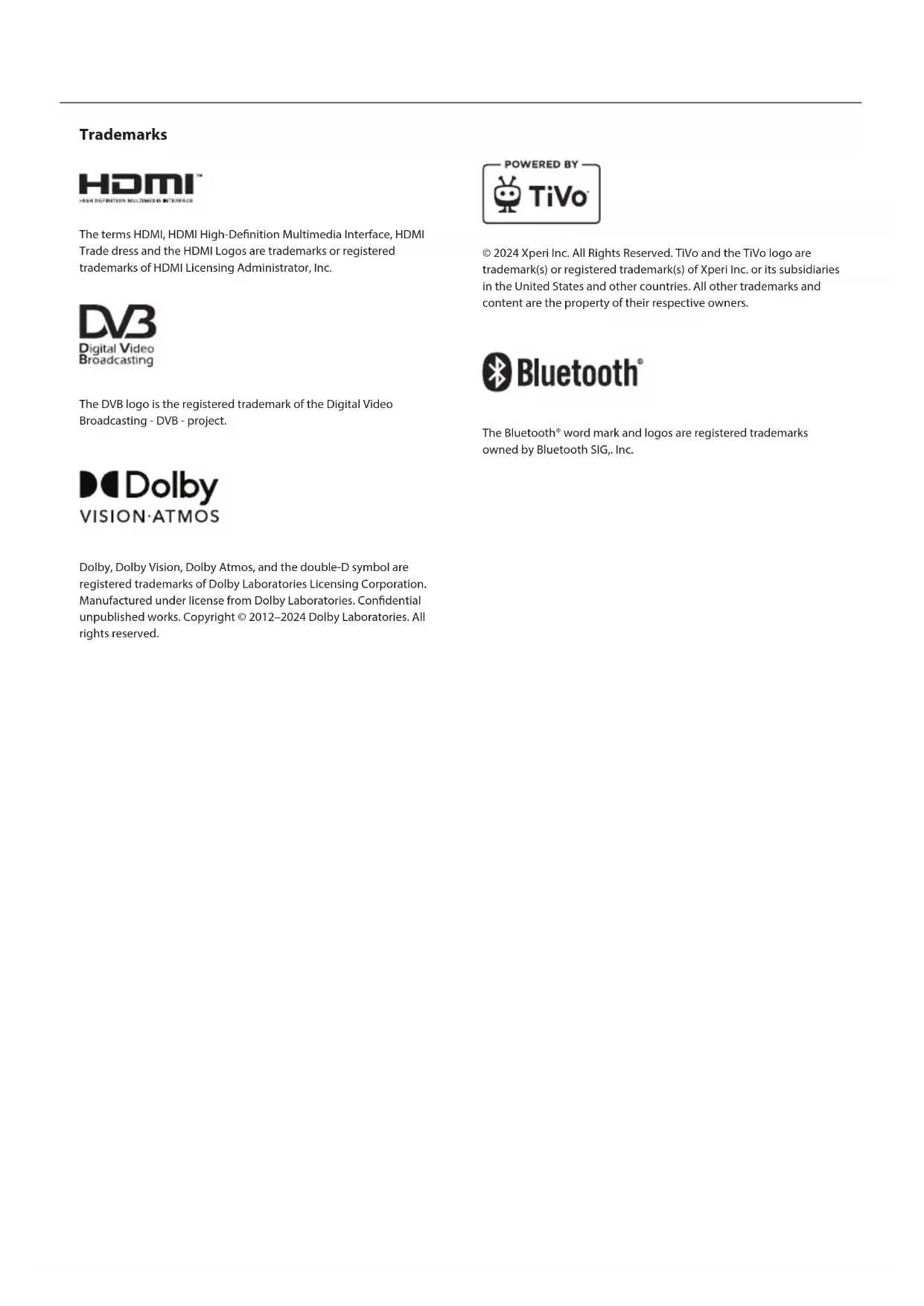Instruction manual EN FRDE IT ES PLTrademarks The terms HDMI, HDMI High-Denition Multimedia Interface, HDMI Trade dress and the HDMI Logos are trademarks or registered trademarks of HDMI Licensing Administrator, Inc. The DVB logo is the registered trademark of the Digital Video Broadcasting - DVB - project. Dolby, Dolby Vision, Dolby Atmos, and the double-D symbol are registered trademarks of Dolby Laboratories Licensing Corporation. Manufactured under license from Dolby Laboratories. Condential unpublished works. Copyright © 2012–2024 Dolby Laboratories. All rights reserved. © 2024 Xperi Inc. All Rights Reserved. TiVo and the TiVo logo are trademark(s) or registered trademark(s) of Xperi Inc. or its subsidiaries in the United States and other countries. All other trademarks and content are the property of their respective owners. The Bluetooth® word mark and logos are registered trademarks owned by Bluetooth SIG,. Inc.4 Getting started Inputting text On -Screen Keyboard The on-screen keyboard lets you type text like a Wi-Fi password or movie title using your remote control. Highlight the character you want using the [ARROW] buttons and press [OK]. If you press and hold the [OK] button for one second on a selected character, this will display the associated national characters with accents or diacritical marks. Using the Remote Control You can operate many of the TV’s features by using the UP, DOWN, LEFT, RIGHT and OK buttons on the remote control. The following remote control buttons are used to navigate the menus: [BACK] – Takes you one step back in the menu. Press and hold to exit from the menu or app and return to the source or Home screen. [ARROW BUTTONS] – Navigate around the options on the screen. [OK] – Conrms the highlighted or selected option. Connecting External Devices Before turning your TV on, it is recommended that your external devices are connected before continuing with the rst-time installation process. Depending on the source connectivity on your TV, follow the guidance below when connecting external devices. HDMI Connection For optimum picture quality, we recommend connecting your device to the TV using an HDMI cable. (B) (A) HDMIHDMI (A) External Device (B) HDMI cable (not supplied) HDMI CEC-Compatible Devices If an HDMI CEC-compatible device (e.g. Blu-ray player, AV receiver) is connected with an HDMI cable, you can operate the device with the TV’s remote control. We recommend using the HDMI (ARC) connection when used with an AV receiver – please refer to the ARC section of this manual. Activating HDMI CEC ū Turn on the connected device. To enable HDMI control, press the (TiVo) button, then select [Settings] > [Sources], scroll down and activate [HDMI CEC]. ū Activate HDMI control on the connected device. Features Available to Compatible CEC Devices [Blu-ray/DVD player] ū Automatically turns the TV on and switches the input to the connected Blu-ray/DVD player when the Blu-ray/DVD player starts to play. ū Automatically turns the connected Blu-ray/ DVD player o when you turn the TV o. ū Controls menu operation ARROW buttons, playback and track selection of the connected Blu-ray/DVD player through the TV’s remote control. [AV Receiver] ū Automatically turns the connected AV receiver on and switches the sound output from the TV speaker to the audio system when you turn the TV on. This function is only available if you have previously used the AV receiver to output the TV’s sound. ū Automatically switches the sound output to the AV receiver by turning the AV receiver on when the TV is turned on. ū Automatically turns the connected AV receiver o when you turn the TV o. ū Adjust the volume and mute functions via the [VOL+/–] and [MUTE] buttons on your TV remote control. [Video Camera] ū Automatically turns the TV on and switches the input to the connected video camera when the camera is turned on. ū Automatically turns the connected video camera o when you turn the TV o. ū Controls menu operation [ARROW] buttons, playback, e.g. [PLAY] button of the connected video camera through the TV’s remote control. NOTE: Not all devices with HDMI input/output are HDMI CEC compatible. For information about CEC compatibility, refer to the instruction manual of the device. Refer to “HDMI connection (ARC/eARC)” section of this manual for information relating to connecting an HDMI (ARC) enabled device. Composite Video Connection If your external device has composite jacks/sockets, connect them to the TV using acomposite video/audio cable. Mini AV Connection