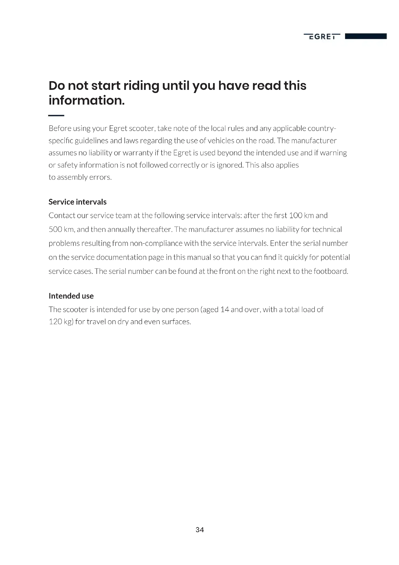 SCOOTER DOCUMENTS (ONLY FORGERMANY)EGRET XOPERATING INSTRUCTIONSEQUIPMENT Charger Lock eyelet Tire ination adapter 4 Tools Mounting material34 Do not start riding until you have read this information. Before using your Egret scooter, take note of the local rules and any applicable country- specic guidelines and laws regarding the use of vehicles on the road. The manufacturer assumes no liability or warranty if the Egret is used beyond the intended use and if warning or safety information is not followed correctly or is ignored. This also applies to assembly errors. Service intervals Contact our service team at the following service intervals: after the rst 100 km and 500 km, and then annually thereafter. The manufacturer assumes no liability for technical problems resulting from non-compliance with the service intervals. Enter the serial number on the service documentation page in this manual so that you can nd it quickly for potential service cases. The serial number can be found at the front on the right next to the footboard. Intended use The scooter is intended for use by one person (aged 14 and over, with a total load of 120 kg) for travel on dry and even surfaces.35 Before riding for the rst time We recommend that you always wear a helmet, sturdy footwear and suitable protective equipment. Always ride carefully and responsibly and pay attention to other people around you. For your rst ride, we recommend that you nd a clear, even surface where there is no or very little trafc. Test all the functions, particularly the brakes, to make sure that you can bring the scooter to a halt safely and can also operate the brakes safely in an emergency. Start with the lowest riding mode and increase it when you feel safe and condent. Take your time to get use to the scooter. The throttle can be very sensitive in the highest riding mode. Be aware that rapid or abrupt operation may unbalance you. Take things slowly and familiarise yourself with all of the scooter’s functions and riding modes. Check the air pressure of the front and rear tyres before each ride, but in particular before your rst ride. The pressure should be between 2.2 and 3.0 bar. If the air pressure is too low, the tyres have greater friction, which leads to a shorter range. Shift your weight forwards slightly when accelerating and shift it backwards slightly when braking. This is key to condent riding. Before starting your ride, check that all screws and the folding mechanism are secure. The folding mechanism must be fully locked and must not have any play. Loose screws and/ or a folding mechanism that is not locked in place can cause serious accidents and/ or injury. Before each ride, make sure that the side stand is fully folded in, the tyres and brakes are in a good condition and the tyres are pumped up with the correct air pressure. To ensure good grip and safe riding, avoid the following surfaces: