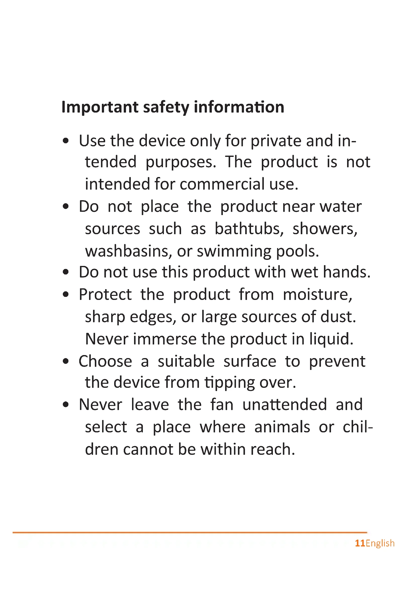 - Never leave the fan unaended and select a place where animals or chil- dren cannot be within reach.12 English