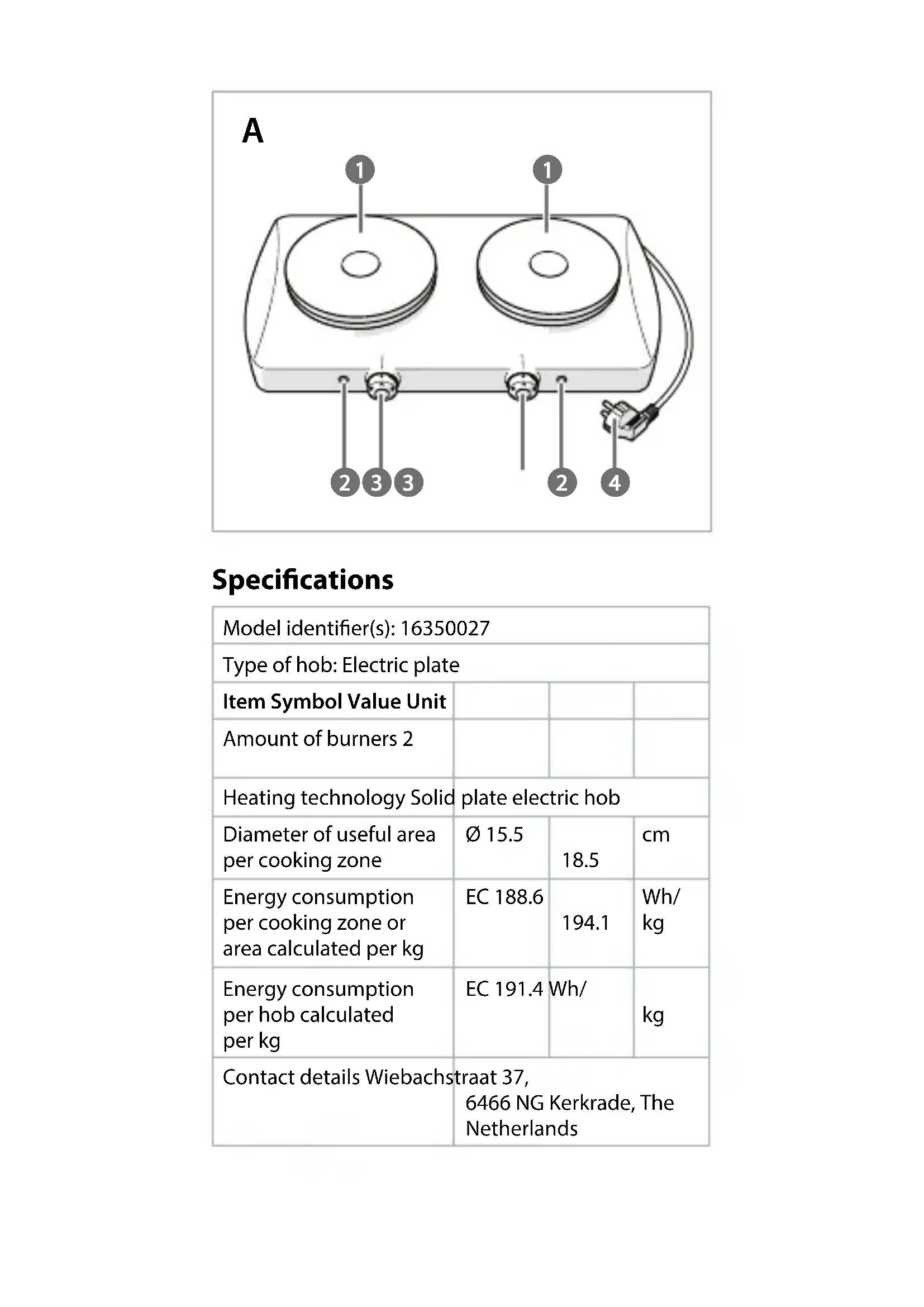 Specications Model identier(s): 16350027 Type of hob: Electric plate Item Symbol Value Unit Amount of burners 2 Heating technology Solid plate electric hob Diameter of useful area per cooking zone Ø 15.5