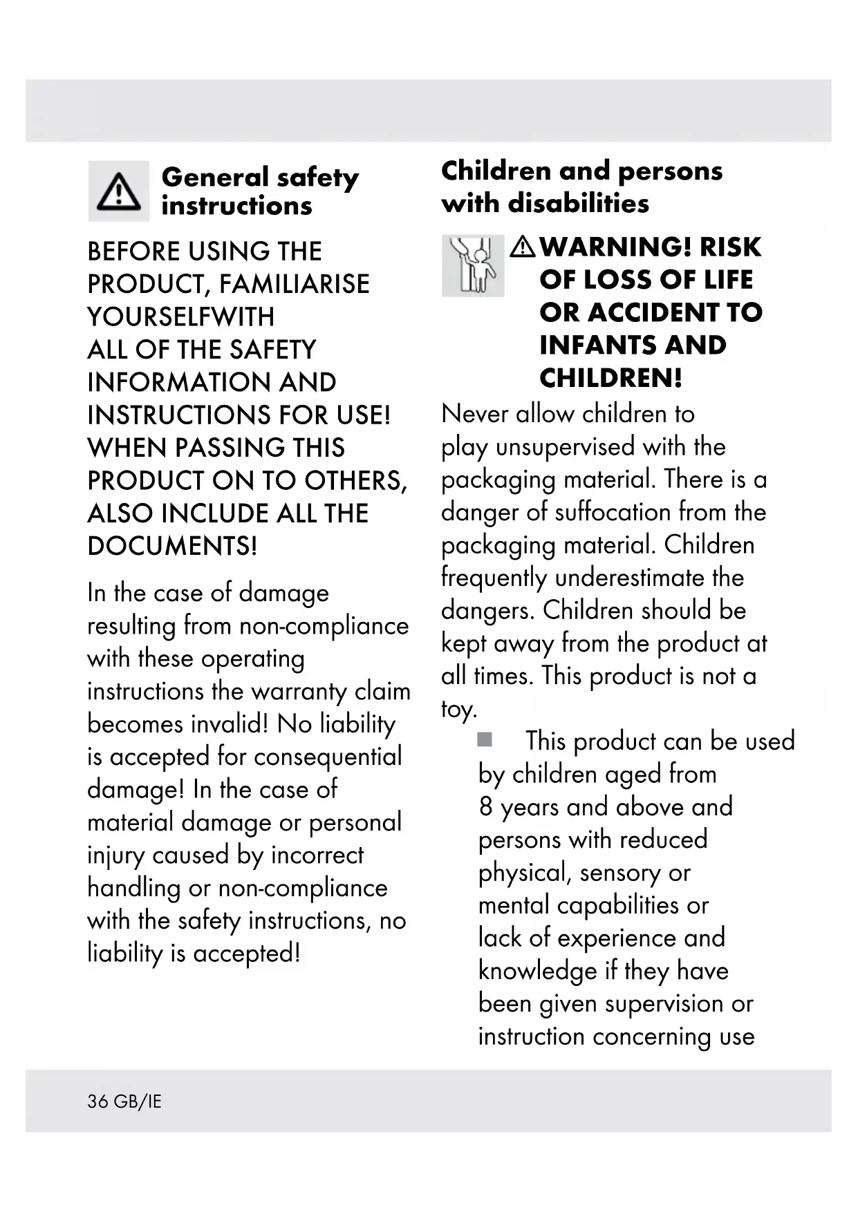 DOCUMENTS! In the case of damage resulting from non-compliance with these operating instructions the warranty claim becomes invalid! No liability is accepted for consequential damage! In the case of material damage or personal injury caused by incorrect handling or non-compliance with the safety instructions, no liability is accepted! Children and persons with disabilities
