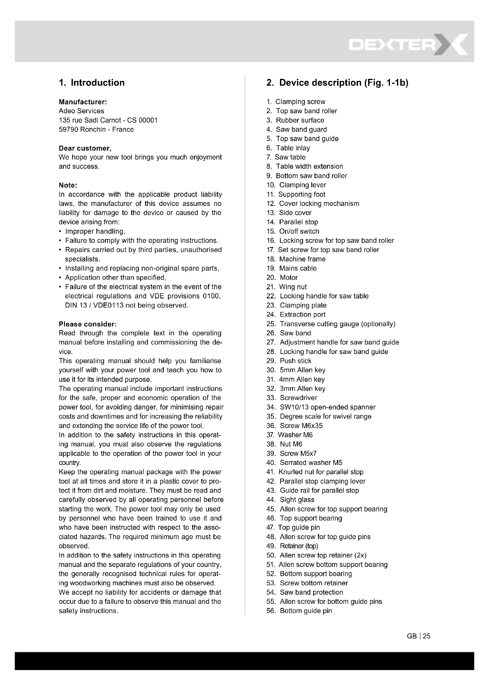 Fault Possible cause Remedy Motor does not work Motor, cable or plug defective, fuses burnt Open housing cover (limit switch) Arrange for inspection of the machine by a specialist. Never repair the motor yourself. Danger! Check fuses and replace if necessary Close housing cover precisely The engine runs slowly and does not reach the operating speed. Voltage too low, coils damaged, capacitor burnt Contact the utility provider to check the voltage. Arrange for inspection of the motor by a specialist. Arrange for replacement of the capacitor by a specialist Motor makes excessive noise Coils damaged, motor defective Arrange for inspection of the motor by a specialist The motor does not reach its full power. Circuits in the network are overloaded (lamps, other motors, etc.) Do not use any other equipment or motors on the same circuit Motor overheats easily. Overloading of the motor, insucient cooling of the motor Avoid overloading the motor while cutting, remove dust from the motor in order to ensure optimal cooling of the motor Saw cut is rough or wavy Saw blade dull, tooth shape not appropriate for the material thickness Resharpen saw blade and/or use suitable saw blade Workpiece pulls away and/or splinters Excessive cutting pressure and/or saw blade not suitable for use Insert suitable saw blade Saw band drifting Guide incorrectly adjusted Incorrect saw band Adjust the saw band guide according to the operating manual Select saw band according to the operating manual Burn marks on the wood when working Saw band blunt Incorrect saw band Replace saw band Select saw band according to the operating manual Saw band jams when working Saw band blunt Saw band resinous Guide incorrectly adjusted Replace saw band Clean saw band Adjust the saw band guide according to the operating manual GUARANTEE: Thank you for investing in a ADEO power tool. These products have been made to demanding, high-quality standards and are guaranteed for domestic use against manufacturing faults for a period of 24 months from the date of purchase. This guarantee does not aect your statutory rights. In case of any malfunction of your tool (failure, missing part, etc.), please contact service. Service address: ADEO’s Service address: 135 RUE SADI CARNOT CS00001, 59790 RONCHIN, FRANCE Normal wear and tear, including accessory wear, is not covered under guarantee. The product is guaranteed for 24 months if used for normal demostic use. Any guarantee is invalid if the product has been overloaded or subject to ne- glect, improper use or an attempted repair other than by an authorized agent. Heavy-duty, daily professional or hire usage are not guaranteed. Due to continuous product improvement, we reserve the right to change the product specication without prior notice.FR