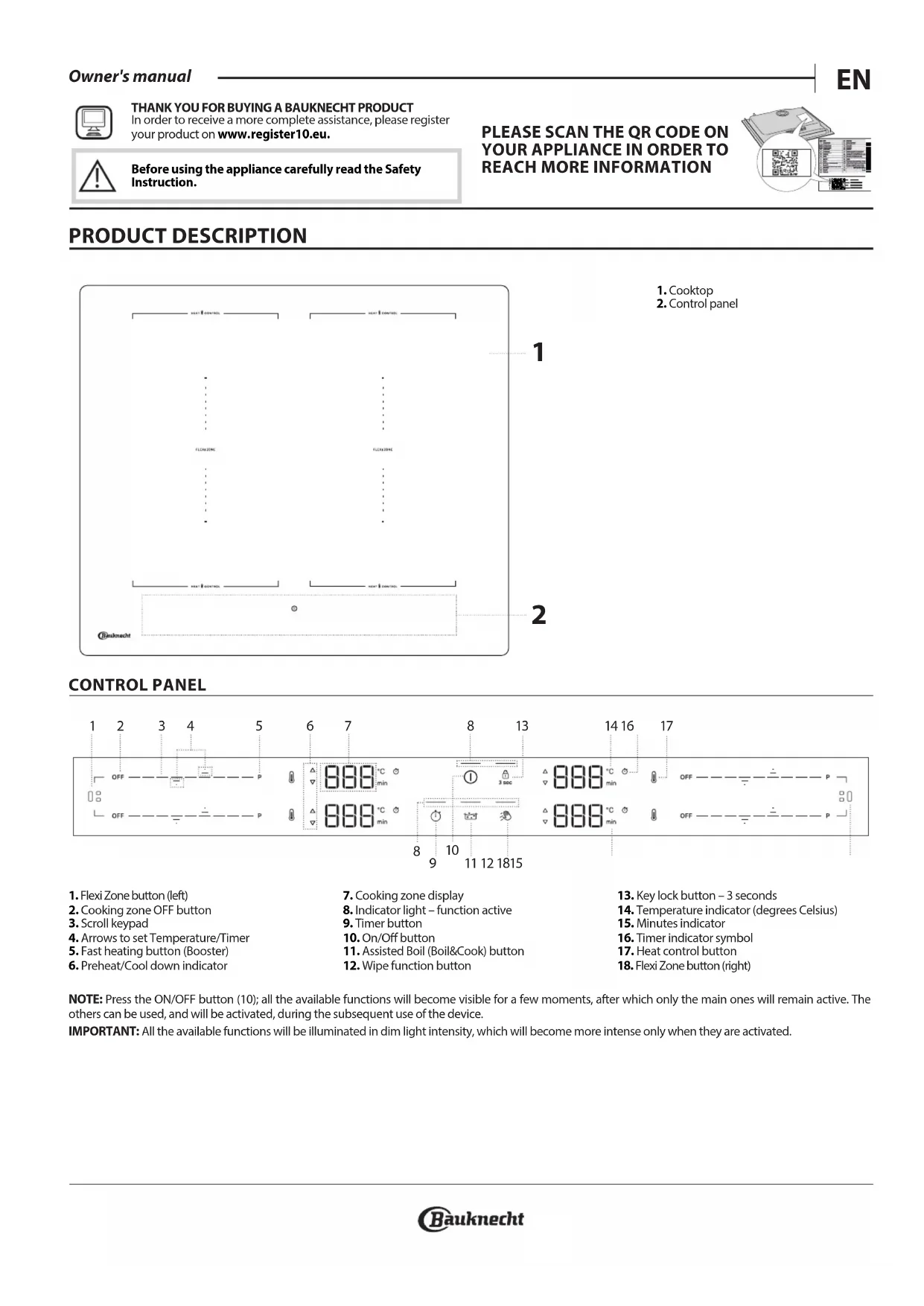 1. Flexi Zone button (left)2. Cooking zone OFF button3. Scroll keypad4. Arrows to set Temperature/Timer5. Fast heating button (Booster)6. Preheat/Cool down indicator7. Cooking zone display8. Indicator light – function active9. Timer button10. On/O button11. Assisted Boil (Boil&Cook) button12. Wipe function button13. Key lock button – 3 seconds14. Temperature indicator (degrees Celsius)15. Minutes indicator 16. Timer indicator symbol17. Heat control button 18. Flexi Zone button (right) NOTE: Press the ON/OFF button (10); all the available functions will become visible for a few moments, after which only the main ones will remain active. The others can be used, and will be activated, during the subsequent use of the device. IMPORTANT: All the available functions will be illuminated in dim light intensity, which will become more intense only when they are activated. THANK YOU FOR BUYING A BAUKNECHT PRODUCTIn order to receive a more complete assistance, please register your product on www.register10.eu.