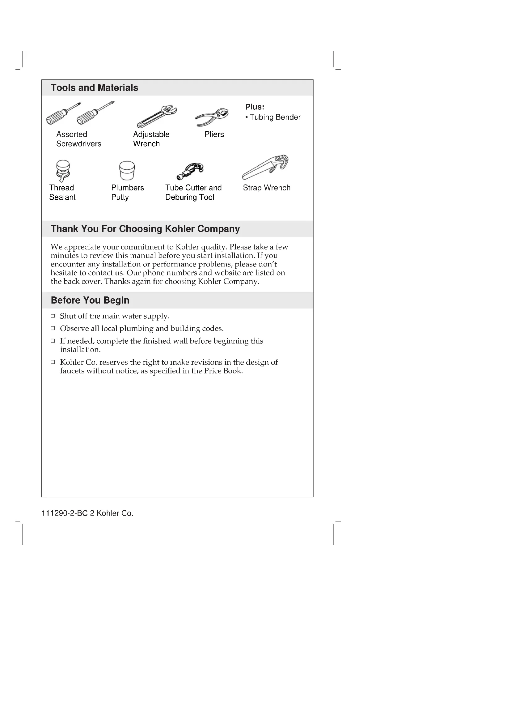 Installation Guide Shelf-Back Faucet M product numbers are for Mexico (i.e. K-12345M) Los números de productos seguidos de M corresponden a México (Ej. K-12345M) Français, page “Français-1” Español, página “Español-1” K-7302 K-8040 K-8046 111290-2-BCTools and Materials Thank You For Choosing Kohler Company We appreciate your commitment to Kohler quality. Please take a few minutes to review this manual before you start installation. If you encounter any installation or performance problems, please don’t hesitate to contact us. Our phone numbers and website are listed on the back cover. Thanks again for choosing Kohler Company. Before You Begin Shut off the main water supply. Observe all local plumbing and building codes. If needed, complete the finished wall before beginning this installation. Kohler Co. reserves the right to make revisions in the design of faucets without notice, as specified in the Price Book. Adjustable Wrench Plumbers Putty Thread Sealant Tube Cutter and Deburing Tool Pliers Assorted Screwdrivers Plus: