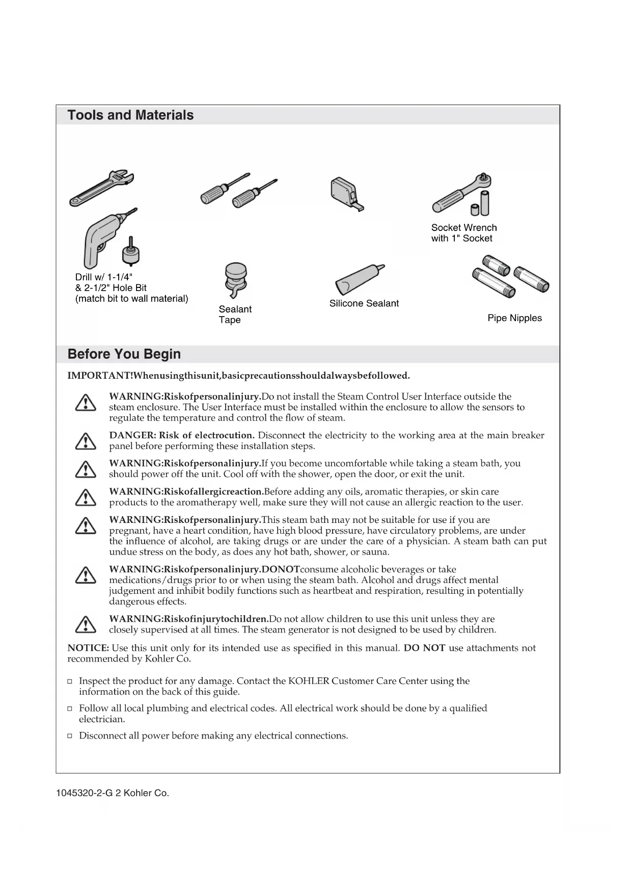 closely supervised at all times. The steam generator is not designed to be used by children. NOTICE: Use this unit only for its intended use as specified in this manual. DO NOT use attachments not recommended by Kohler Co. Inspect the product for any damage. Contact the KOHLER Customer Care Center using the information on the back of this guide. Follow all local plumbing and electrical codes. All electrical work should be done by a qualified electrician. Disconnect all power before making any electrical connections. Silicone Sealant Drill w/ 1-1/4" & 2-1/2" Hole Bit (match bit to wall material) Sealant Tape Socket Wrench with 1" Socket Pipe Nipples 1045320-2-G 2 Kohler Co.Before You Begin (cont.) Kohler Co. reserves the right to make revisions in the design of products without notice, as specified in the Price Book. Kohler Co. 3 1045320-2-GReview Layout