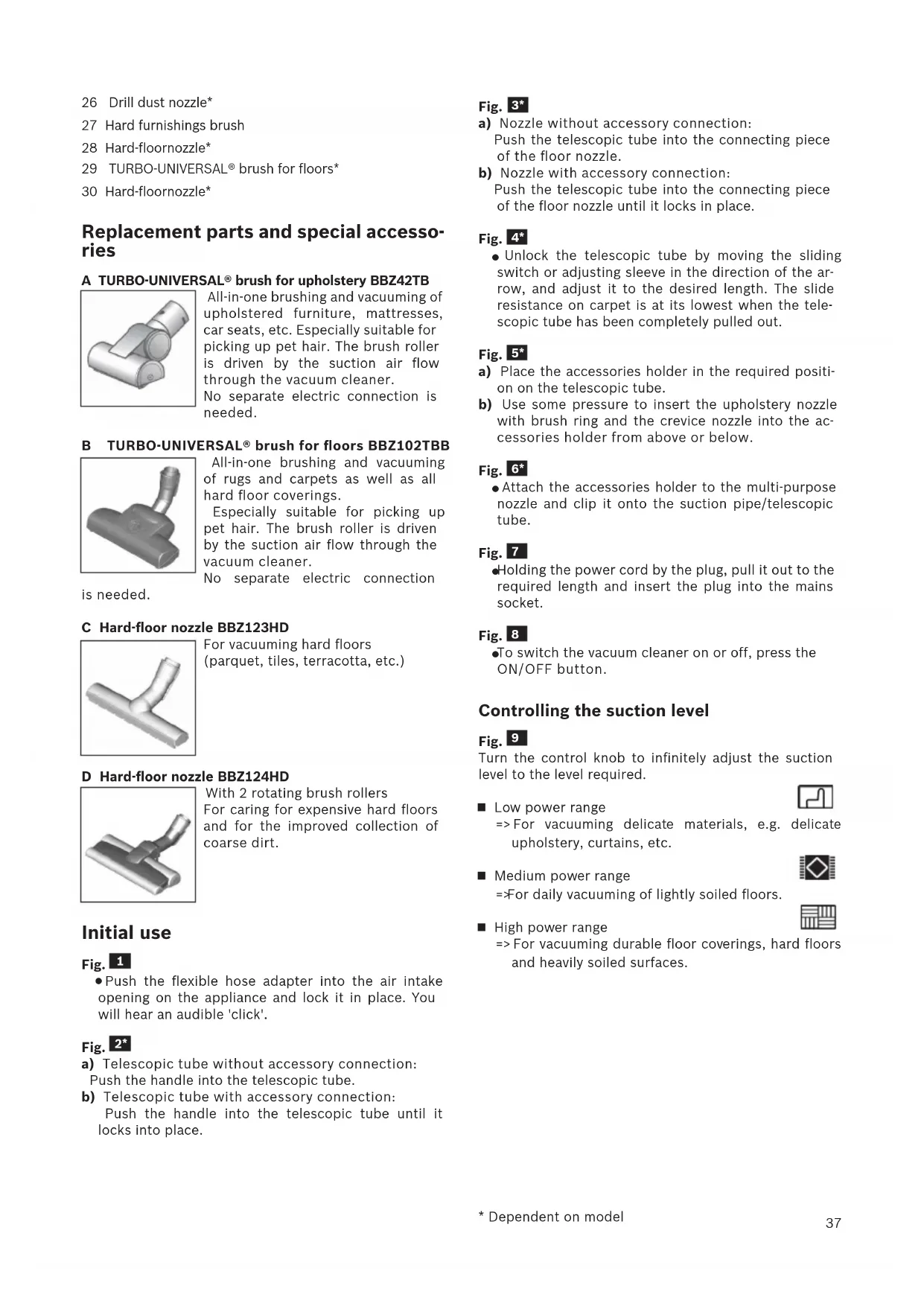 - Dependent on model37 26 Drill dust nozzle* 27 Hard furnishings brush 28 Hard-floor nozzle* 29 TURBO-UNIVERSAL® brush for floors* 30 Hard-floor nozzle* Replacement parts and special accesso- ries A TURBO-UNIVERSAL® brush for upholstery BBZ42TB All-in-one brushing and vacuuming of upholstered furniture, mattresses, car seats, etc. Especially suitable for picking up pet hair. The brush roller is driven by the suction air flow through the vacuum cleaner. No separate electric connection is needed. B TURBO-UNIVERSAL® brush for floors BBZ102TBB All-in-one brushing and vacuuming of rugs and carpets as well as all hard floor coverings. Especially suitable for picking up pet hair. The brush roller is driven by the suction air flow through the vacuum cleaner. No separate electric connection is needed. C Hard-floor nozzle BBZ123HD For vacuuming hard floors (parquet, tiles, terracotta, etc.) D Hard-floor nozzle BBZ124HD