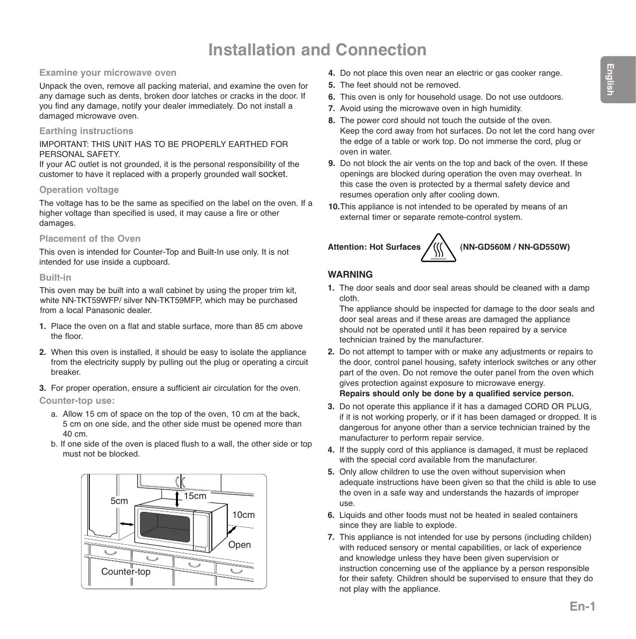 with reduced sensory or mental capabilities, or lack of experience and knowledge unless they have been given supervision or instruction concerning use of the appliance by a person responsible for their safety. Children should be supervised to ensure that they do not play with the appliance. En-1 English Examine your microwave oven Safety Instructions Use of your oven Fan motor operation