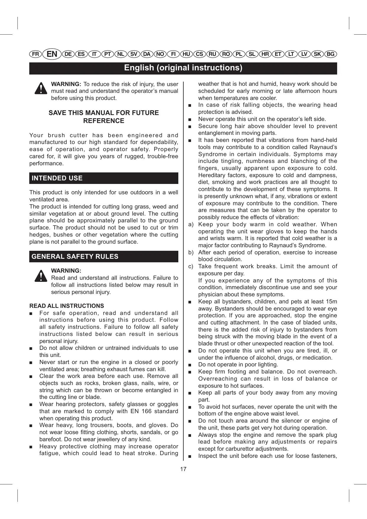 Q For safe operation, read and understand all instructions before using this product. Follow all safety instructions. Failure to follow all safety instructions listed below can result in serious personal injury. Q Do not allow children or untrained individuals to use this unit. Q Never start or run the engine in a closed or poorly ventilated area; breathing exhaust fumes can kill. Q Clear the work area before each use. Remove all objects such as rocks, broken glass, nails, wire, or string which can be thrown or become entangled in the cutting line or blade. Q Wear hearing protectors, safety glasses or goggles that are marked to comply with EN 166 standard when operating this product. Q Wear heavy, long trousers, boots, and gloves. Do not wear loose fitting clothing, shorts, sandals, or go barefoot. Do not wear jewellery of any kind. Q Heavy protective clothing may increase operator fatigue, which could lead to heat stroke. During