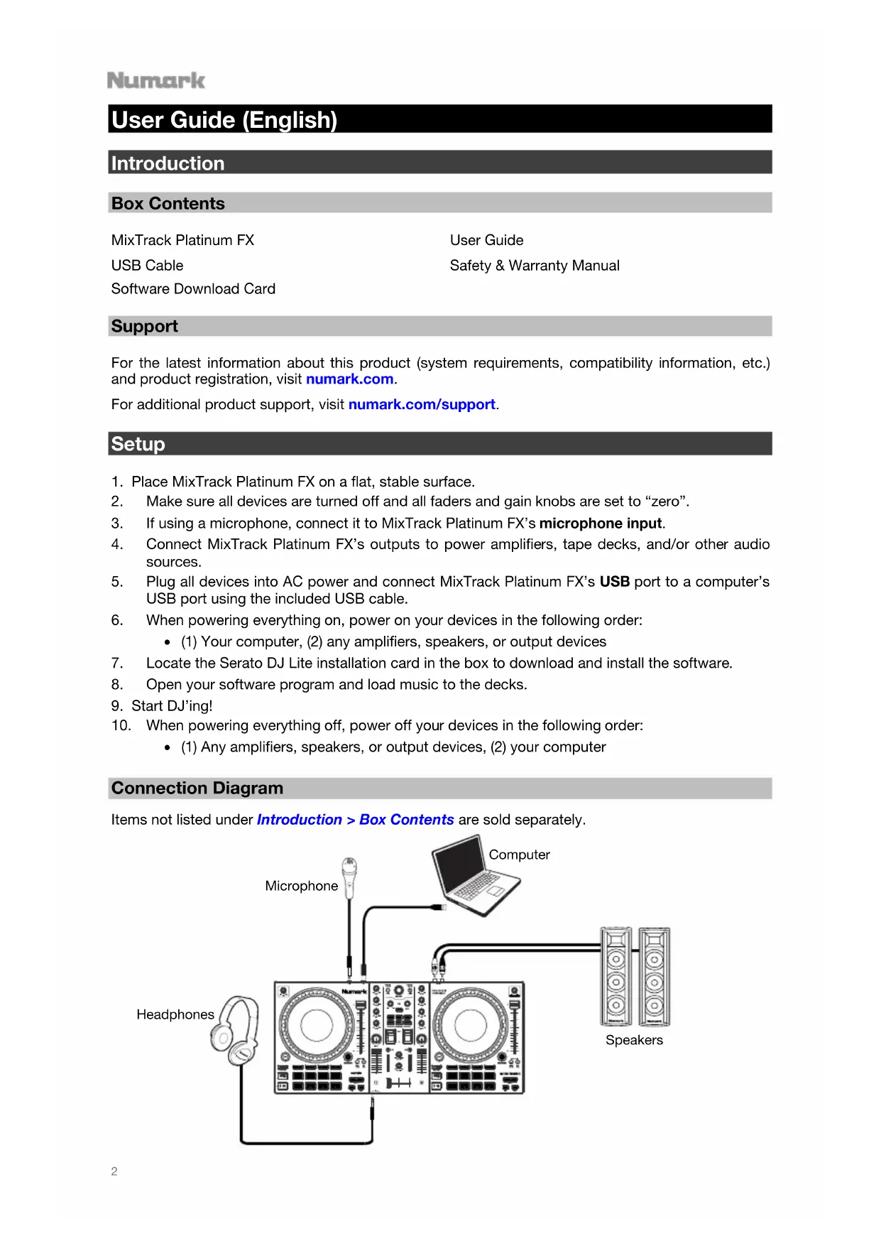 User Guide (English) Introduction Box Contents MixTrack Platinum FX USB Cable Software Download Card User Guide Safety & Warranty Manual Support For the latest information about this product (system requirements, compatibility information, etc.) and product registration, visit numark.com. For additional product support, visit numark.com/support. Setup