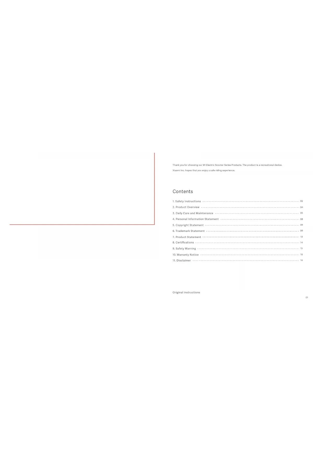 4. Personal Information StatementOriginal instructionsThank you for choosing our Mi Electric Scooter Series Products. The product is a recreational device. Xiaomi Inc. hopes that you enjoy a safe riding experience.IMPORTANT! Read carefully and keep for future reference. For more information about the instructions of Mi Electric Scooter series products, please visit www.mi.com/global/service/userguide.