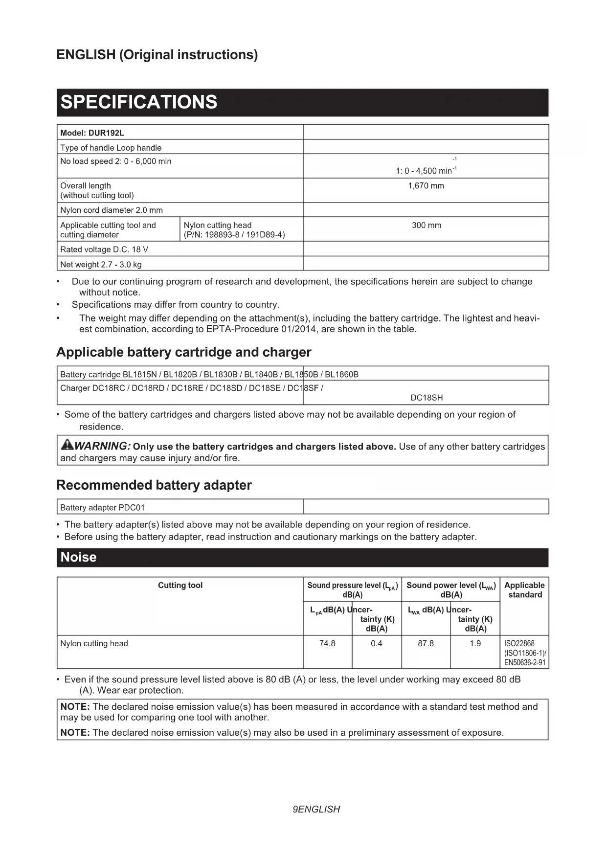 - Before using the battery adapter, read instruction and cautionary markings on the battery adapter. Noise Cutting tool Sound pressure level (L