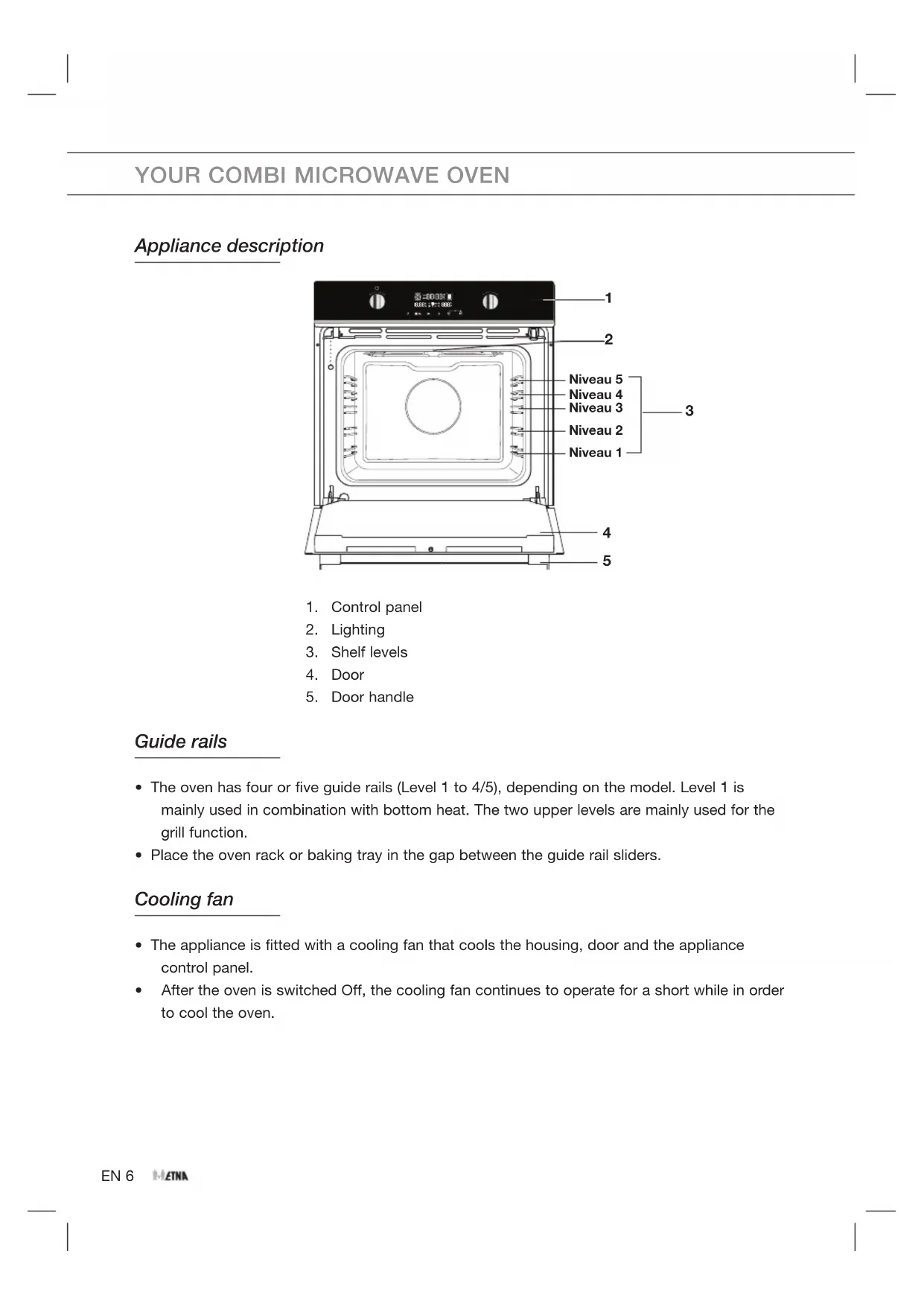 - The oven has four or five guide rails (Level 1 to 4/5), depending on the model. Level 1 is mainly used in combination with bottom heat. The two upper levels are mainly used for the grill function.