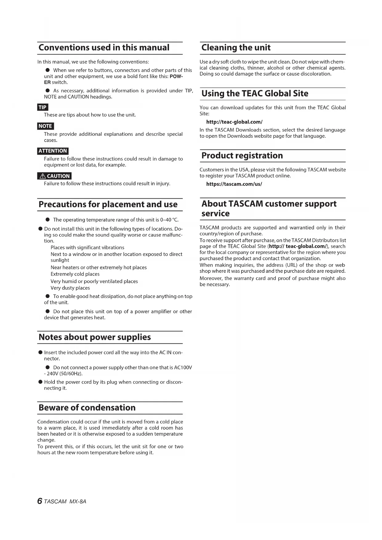 CAUTION Failure to follow these instructions could result in injury. Precautions for placement and use 0 The operating temperature range of this unit is 0–40 °C. 0 Do not install this unit in the following types of locations. Do- ing so could make the sound quality worse or cause malfunc- tion. Places with significant vibrations Next to a window or in another location exposed to direct sunlight Near heaters or other extremely hot places Extremely cold places Very humid or poorly ventilated places Very dusty places 0 To enable good heat dissipation, do not place anything on top of the unit. 0 Do not place this unit on top of a power amplifier or other device that generates heat. Notes about power supplies 0 Insert the included power cord all the way into the AC IN con- nector. 0 Do not connect a power supply other than one that is AC100V - 240V (50/60Hz). 0 Hold the power cord by its plug when connecting or discon- necting it. Beware of condensation Condensation could occur if the unit is moved from a cold place to a warm place, it is used immediately after a cold room has been heated or it is otherwise exposed to a sudden temperature change. To prevent this, or if this occurs, let the unit sit for one or two hours at the new room temperature before using it. Cleaning the unit Use a dry soft cloth to wipe the unit clean. Do not wipe with chem- ical cleaning cloths, thinner, alcohol or other chemical agents. Doing so could damage the surface or cause discoloration. Using the TEAC Global Site You can download updates for this unit from the TEAC Global Site: http://teac-global.com/ In the TASCAM Downloads section, select the desired language to open the Downloads website page for that language. Product registration Customers in the USA, please visit the following TASCAM website to register your TASCAM product online. https://tascam.com/us/ About TASCAM customer support service TASCAM products are supported and warrantied only in their country/region of purchase. To receive support after purchase, on the TASCAM Distributors list page of the TEAC Global Site (http:// teac-global.com/), search for the local company or representative for the region where you purchased the product and contact that organization. When making inquiries, the address (URL) of the shop or web shop where it was purchased and the purchase date are required. Moreover, the warranty card and proof of purchase might also be necessary.TASCAM MX-8A