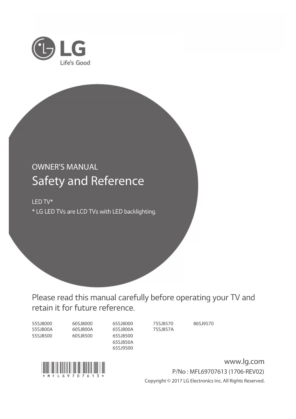 Safety and Reference LED TV** LG LED TVs are LCD TVs with LED backlighting. Please read this manual carefully before operating your TV and retain it for future reference. 55SJ800055SJ800A55SJ850060SJ800060SJ800A60SJ850065SJ800065SJ800A65SJ850065SJ850A65SJ950075SJ857075SJ857A86SJ9570Copyright © 2017 LG Electronics Inc. All Rights Reserved.P/No : MFL69707613 (1706-REV02) *MFL69707613* www.lg.com2 ENGLISH Warning! Important Safety instructions Read these instructions. Keep these instructions. Heed all warnings. Follow all instructions. CAUTION