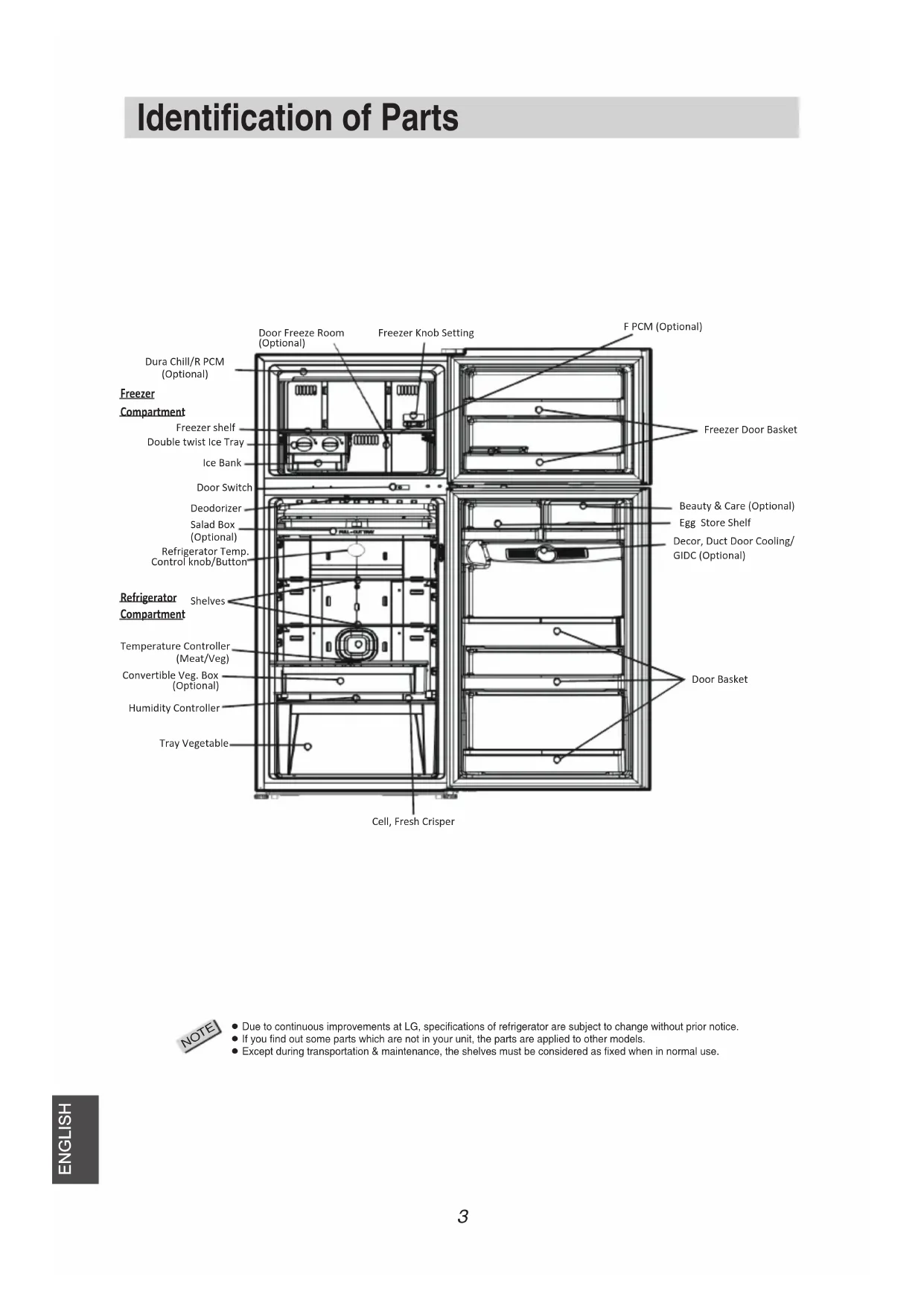 Due to continuous improvements at LG, specifications of refrigerator are subject to change without prior notice. If you find out some parts which are not in your unit, the parts are applied to other models. Except during transportation & maintenance, the shelves must be considered as fixed when in normal use. ENGLISH Freezer Door BasketBeauty & Care (Optional)Egg Store ShelfDecor, Duct Door Cooling/ Door Freeze Room (Optional)Door Basket Humidity ControllerTray VegetableCell, Fresh Crisper Convertible Veg. BoxTemperature Controller(Meat/Veg)ShelvesRefrigerator Temp.Control knob/ButtonDeodorizerDoor SwitchIce BankDouble twist Ice TrayFreezer shelfFreezer Knob Setting Salad Box(Optional) Freezer Compartment Refrigerator Compartment Dura Chill/R PCM(Optional)F PCM (Optional) (Optional)GIDC (Optional)4 Important Safety Information power cord WARNING This is the safety alert symbol. It alerts you to safety messages that inform you of hazards that may kill or hurt you or others or cause damage to the product. All safety messages will be preceded by the safety alert symbol and the hazard signal word DANGER, WARNING or CAUTION. These words mean: Power supply cord should not be bent or pressed under heavy object. power supply cord.loosen