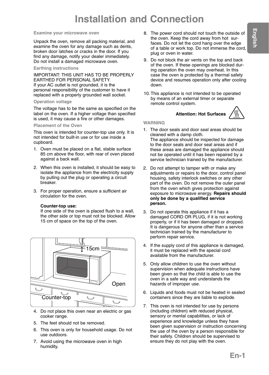 (including children) with reduced physical, sensory or mental capabilities, or lack of experience and knowledge unless they have been given supervision or instruction concerning the use of the oven by a person responsible for their safety. Children should be supervised to ensure they do not play with the oven. En-1 English Examine your microwave oven Safety Instructions Use of your oven
