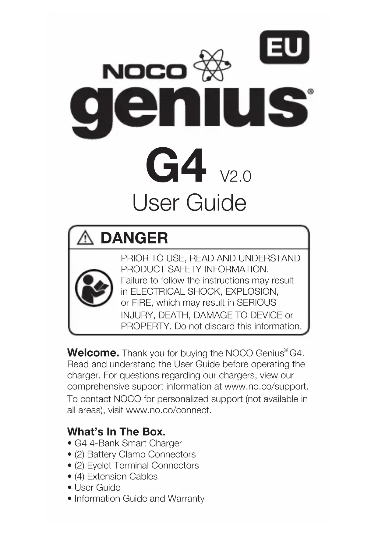 G4. Read and understand the User Guide before operating the charger. For questions regarding our chargers, view our comprehensive support information at www.no.co/support. To contact NOCO for personalized support (not available in all areas), visit www.no.co/connect. What’s In The Box.