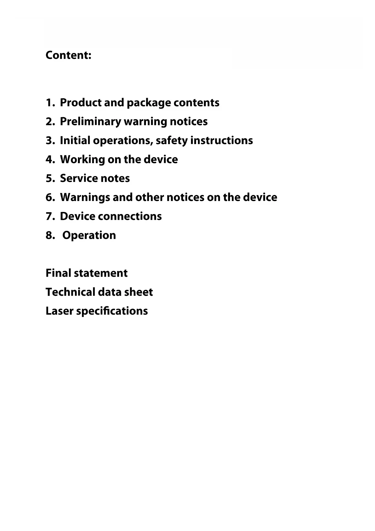 Final statement Technical data sheet Laser specications1. Product and package contents Please check if all listed parts are included and undamaged. Included in delivery: 1 x laser projector 1 x manual 2 x key (for key switch) 1 x power cable 1 x Interlock connector (already attached)