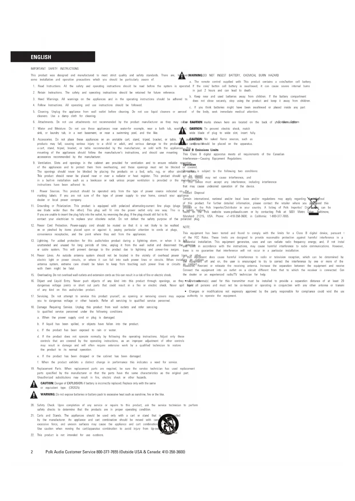roduct or the Polk Importer/Distributor in your country. A listing of Polk Importer/ Distributors can be found on the Polk website www.polkaudio.com or by contacting Polk at: 5601 Metro Drive, Baltimore, Maryland 21215, USA. Phone: +1-410-358-3600; in California: 1-800-377-7655. NOTE: This equipment has been tested and found to comply with the limits for a Class B digital device, pursuant to part 15
