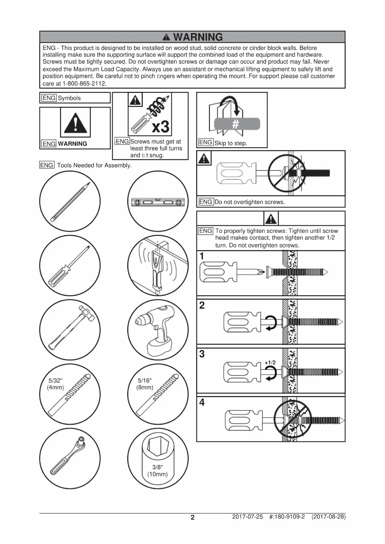 5/32"(4mm)5/16"(8mm)3/8" (10mm)ENG - This product is designed to be installed on wood stud, solid concrete or cinder block walls. Before installing make sure the supporting surface will support the combined load of the equipment and hardware. Screws must be tightly secured. Do not overtighten screws or damage can occur and product may fail. Never exceed the Maximum Load Capacity. Always use an assistant or mechanical lifting equipment to safely lift and position equipment. Be careful not to pinch fi ngers when operating the mount. For support please call customer care at 1-800-865-2112. WARNING3 2017-07-25 #:180-9109-2 (2017-08-28)