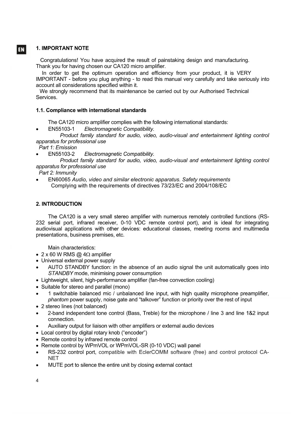 Congratulations! You have acquired the result of painstaking design and manufacturing. Thank you for having chosen our CA120 micro amplifier. In order to get the optimum operation and efficiency from your product, it is VERY IMPORTANT - before you plug anything - to read this manual very carefully and take seriously into account all considerations specified within it. We strongly recommend that its maintenance be carried out by our Authorised Technical Services. 1.1. Compliance with international standards The CA120 micro amplifier complies with the following international standards: EN55103-1 Electromagnetic Compatibility. Product family standard for audio, video, audio-visual and entertainment lighting control apparatus for professional use