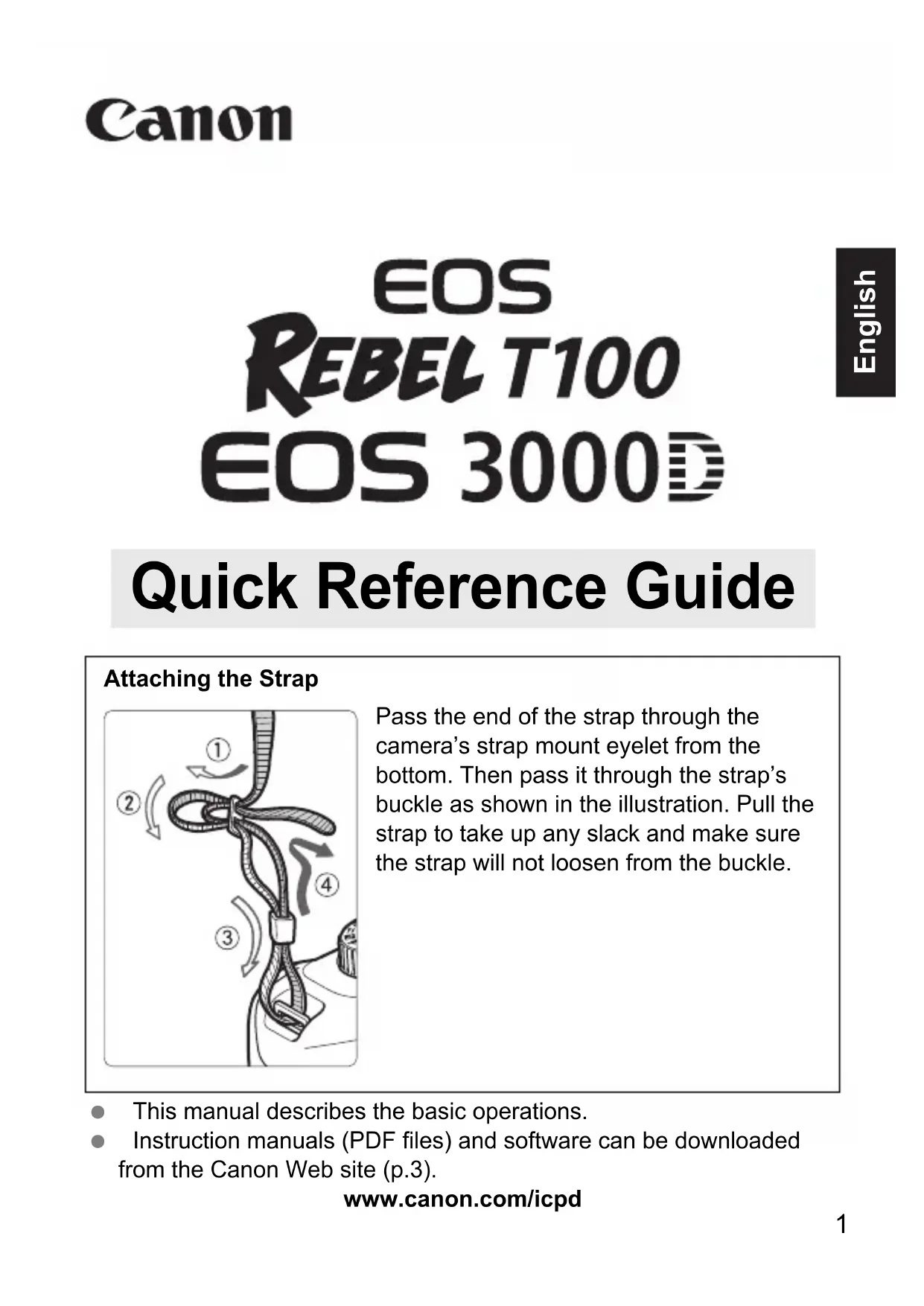 - Battery Charger LC-E10 or LC-E10E is provided. (The LC-E10E comes with a power cord.) The camera does not come with the Software CD-ROM, an interface cable or HDMI cable. The Instruction Manuals provided are listed on the next page. If you purchased a Lens Kit, check that the lenses are included. Be careful not to lose any of the above items. Item Check List Battery Pack LP-E10 (with protective cover) Battery Charger LC-E10/LC-E10E* Strap Camera (with eyecup and body cap) When you need Lens Instruction Manuals, download them from the Canon Web site (p.3). The Lens Instruction Manuals (PDF) are for lenses sold individually. Note that when purchasing the Lens Kit, some of the accessories included with the lens may not match those listed in the Lens Instruction Manual. Software can be downloaded from the Canon Web site for your use.3 Quick Reference Guide The booklet describes the basic operations. More detailed Instruction Manuals (PDF files) can be downloaded from the Canon Web site. 1 Download the Instruction Manuals (PDF files). Connect to the Internet and access the following Canon Web site. www.canon.com/icpd Select your country or region of residence and download the Instruction Manuals. Instruction Manuals Available for Download