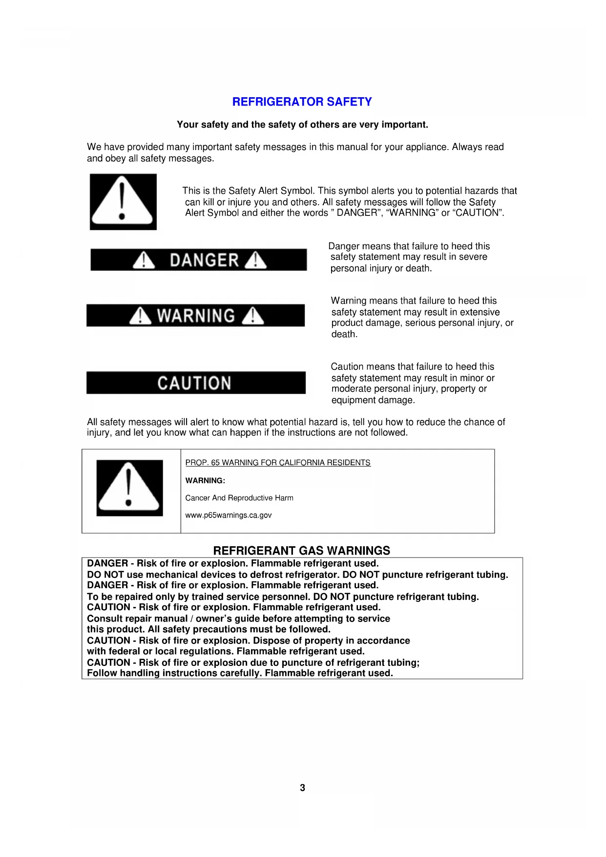 Registration Information and Registration Card Last Page3 REFRIGERATOR SAFETY Your safety and the safety of others are very important. We have provided many important safety messages in this manual for your appliance. Always read and obey all safety messages.
