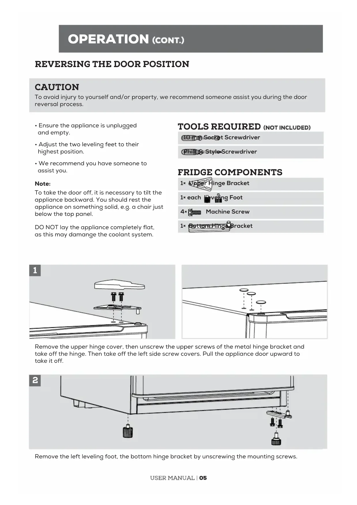 - We recommend you have someone to assist you. Note: To take the door off, it is necessary to tilt the appliance backward. You should rest the appliance on something solid, e.g. a chair just below the top panel. DO NOT lay the appliance completely flat, as this may damange the coolant system. TOOLS REQUIRED 10 mm Socket Screwdriver Phillips Style Screwdriver FRIDGE COMPONENTS 1× Upper Hinge Bracket 1× each Leveling Foot 4× Machine Screw 1× Bottom Hinge Bracket CAUTION To avoid injury to yourself and/or property, we recommend someone assist you during the door reversal process. Remove the upper hinge cover, then unscrew the upper screws of the metal hinge bracket and take off the hinge. Then take off the left side screw covers. Pull the appliance door upward to take it off. Remove the left leveling foot, the bottom hinge bracket by unscrewing the mounting screws.