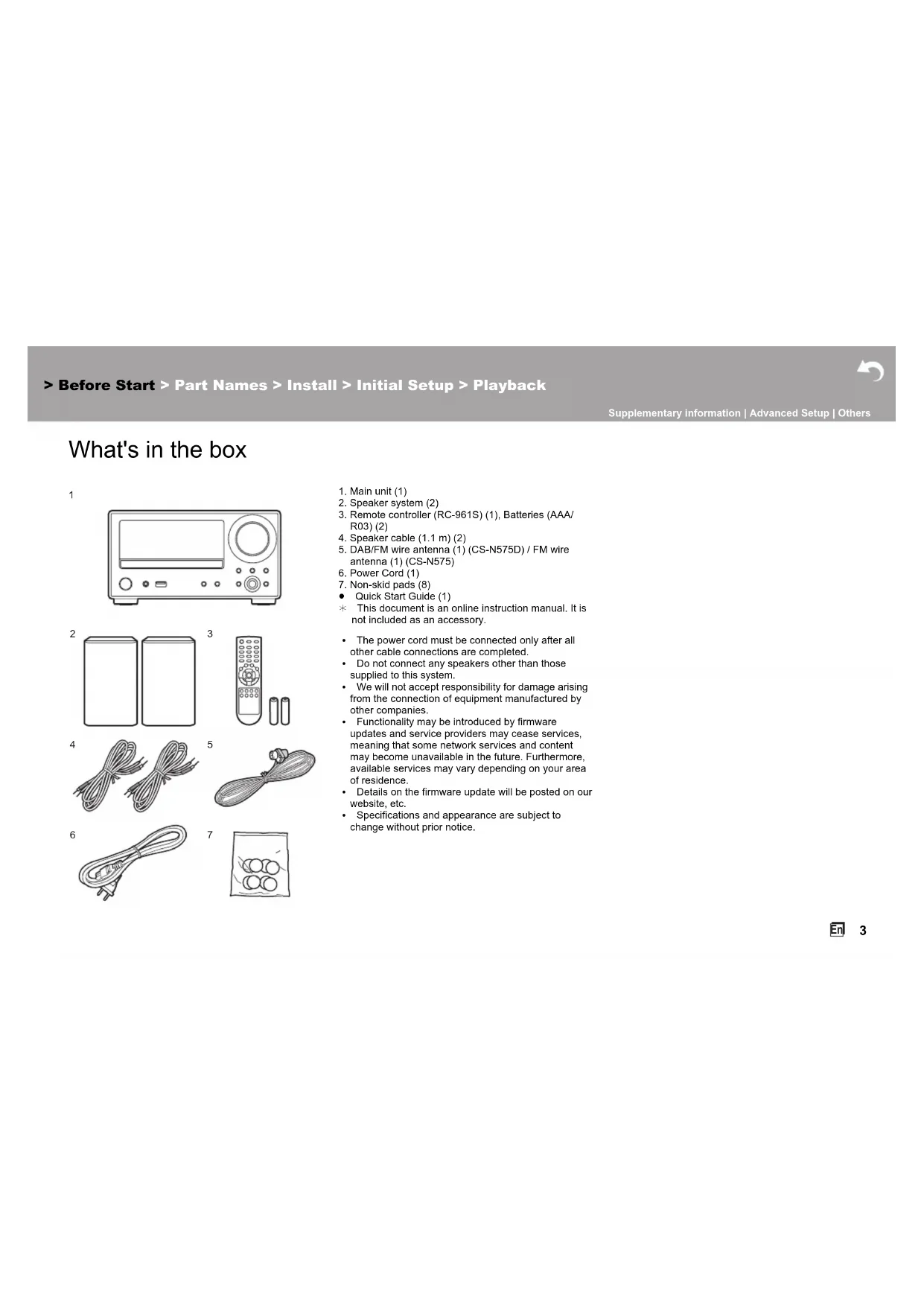 What's in the box 1. Main unit (1)2. Speaker system (2)3. Remote controller (RC-961S) (1), Batteries (AAA/R03) (2)4. Speaker cable (1.1 m) (2)5. DAB/FM wire antenna (1) (CS-N575D) / FM wire antenna (1) (CS-N575)6. Power Cord (1)7. Non-skid pads (8)≥ Quick Start Guide (1)¢ This document is an online instruction manual. It is not included as an accessory.0 The power cord must be connected only after all other cable connections are completed.0 Do not connect any speakers other than those supplied to this system.0 We will not accept responsibility for damage arising from the connection of equipment manufactured by other companies.0 Functionality may be introduced by firmware updates and service providers may cease services, meaning that some network services and content may become unavailable in the future. Furthermore, available services may vary depending on your area of residence.0 Details on the firmware update will be posted on our website, etc.0 Specifications and appearance are subject to change without prior notice.