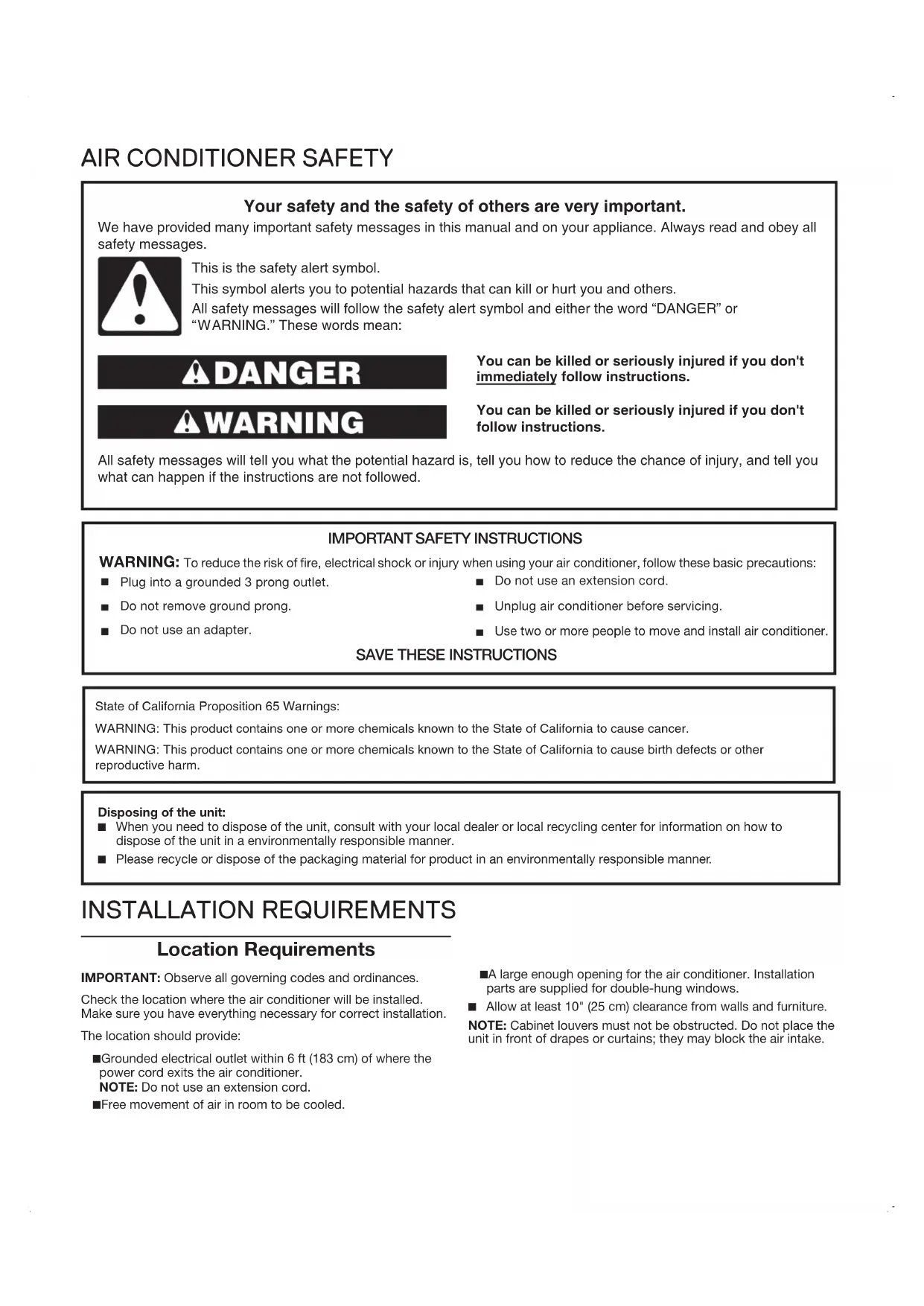 Unplug air conditioner before servicing.Use two or more people to move and install air conditioner.Plug into a grounded 3 prong outlet.Do not remove ground prong.Do not use an adapter.Do not use an extension cord.State of California Proposition 65 Warnings:WARNING: This product contains one or more chemicals known to the State of California to cause cancer.WARNING: This product contains one or more chemicals known to the State of California to cause birth defects or other reproductive harm. INSTALLATION REQUIREMENTS Location Requirements IMPORTANT: Observe all governing codes and ordinances.Check the location where the air conditioner will be installed. Make sure you have everything necessary for correct installation.The location should provide: ■ Grounded electrical outlet within 6 ft (183 cm) of where the power cord exits the air conditioner. NOTE: Do not use an extension cord. ■ Free movement of air in room to be cooled. ■ A large enough opening for the air conditioner. Installation parts are supplied for double-hung windows. ■ Allow at least 10" (25 cm) clearance from walls and furniture. NOTE: Cabinet louvers must not be obstructed. Do not place the unit in front of drapes or curtains; they may block the air intake. Disposing of the unit: ■ When you need to dispose of the unit, consult with your local dealer or local recycling center for information on how to dispose of the unit in a environmentally responsible manner. ■ Please recycle or dispose of the packaging material for product in an environmentally responsible manner. 95116_AMAP081AW_Amana_portable.indd 2 12/1/2016 1:48:38 PM3 Installation Parts Supplied Check that all parts are included in parts package. A. Single vent window insert panel (1) B. Flexible vent hose (1) C. Vent hose round connector (1) D. Vent hose window connector (1)