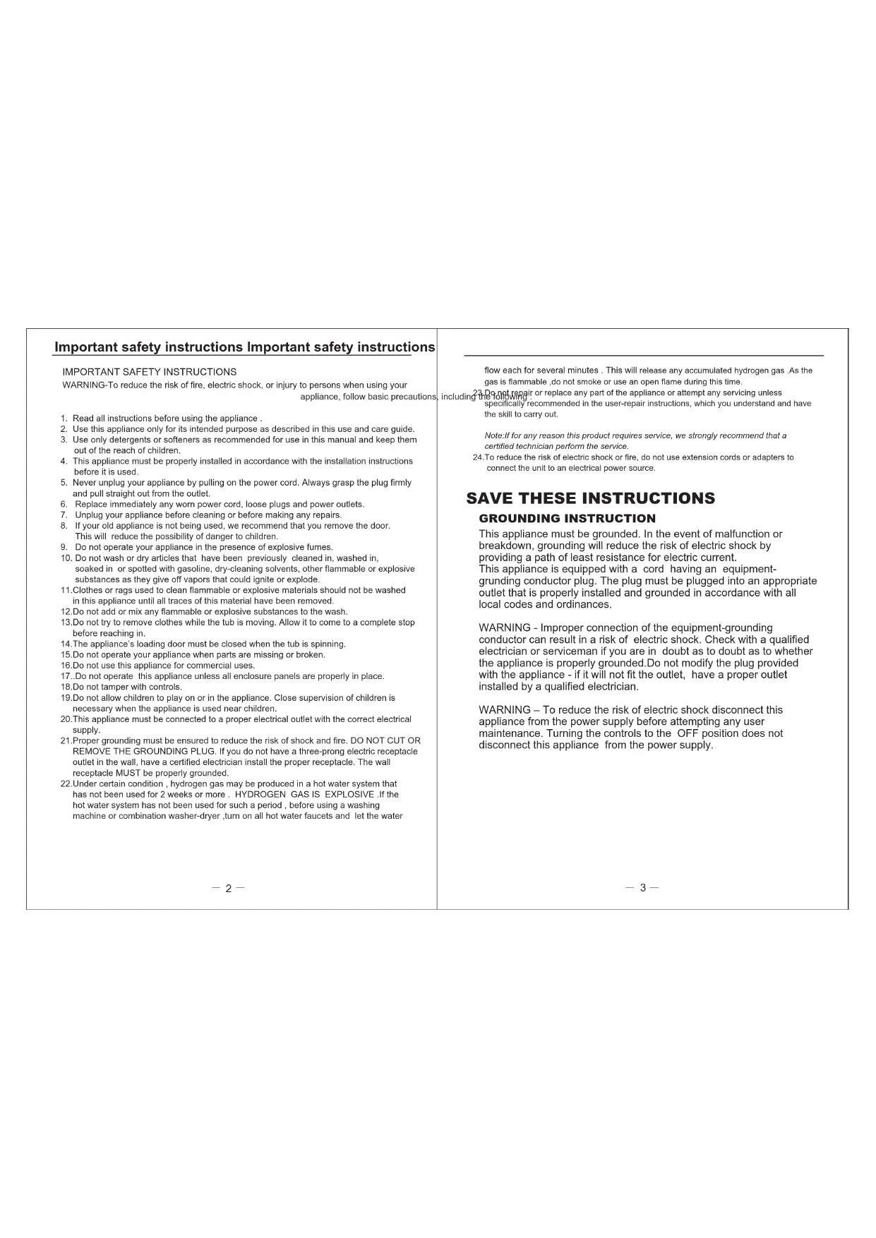 .................................................................Installing Quick Sink AdapterIMPORTANT SAFETY INSTRUCTIONS WARNING-To reduce the risk of fire, electric shock, or injury to persons when using your appliance, follow basic precautions, including the following : 1. Read all instructions before using the appliance .2. Use this appliance only for its intended purpose as described in this use and care guide.3. Use only detergents or softeners as recommended for use in this manual and keep them out of the reach of children.4. This appliance must be properly installed in accordance with the installation instructions before it is used.5. Never unplug your appliance by pulling on the power cord. Always grasp the plug firmly and pull straight out from the outlet.6. Replace immediately any worn power cord, loose plugs and power outlets.7. Unplug your appliance before cleaning or before making any repairs.8. If your old appliance is not being used, we recommend that you remove the door. This will reduce the possibility of danger to children.9. Do not operate your appliance in the presence of explosive fumes.10. Do not wash or dry articles that have been previously cleaned in, washed in, soaked in or spotted with gasoline, dry-cleaning solvents, other flammable or explosive substances as they give off vapors that could ignite or explode.11.Clothes or rags used to clean flammable or explosive materials should not be washed in this appliance until all traces of this material have been removed.12.Do not add or mix any flammable or explosive substances to the wash.13.Do not try to remove clothes while the tub is moving. Allow it to come to a complete stop before reaching in.14.The appliance’s loading door must be closed when the tub is spinning.15.Do not operate your appliance when parts are missing or broken.16.Do not use this appliance for commercial uses.17..Do not operate this appliance unless all enclosure panels are properly in place.18.Do not tamper with controls.19.Do not allow children to play on or in the appliance. Close supervision of children is necessary when the appliance is used near children.20.This appliance must be connected to a proper electrical outlet with the correct electrical supply.21.Proper grounding must be ensured to reduce the risk of shock and fire. DO NOT CUT OR REMOVE THE GROUNDING PLUG. If you do not have a three-prong electric receptacle outlet in the wall, have a certified electrician install the proper receptacle. The wall receptacle MUST be properly grounded.22.Under certain condition , hydrogen gas may be produced in a hot water system that has not been used for 2 weeks or more . HYDROGEN GAS IS EXPLOSIVE .If the hot water system has not been used for such a period , before using a washing machine or combination washer-dryer ,turn on all hot water faucets and let the water