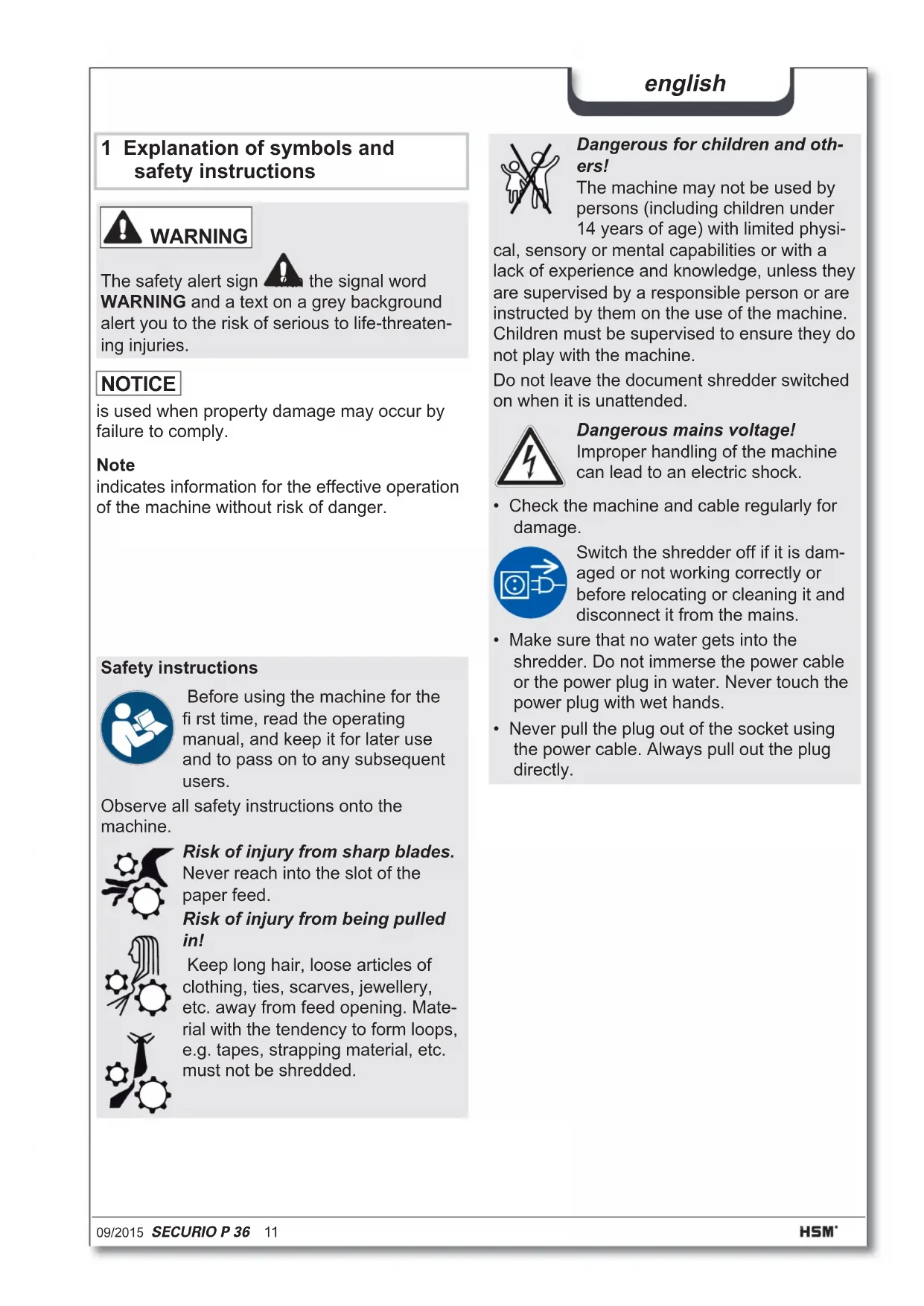 - Let the cutting unit run in the permanent mode for about 10 seconds without any paper. Paper dust and particles are shaken off. WARNING Dangerous mains voltage! Improper handling of the machine can lead to an electric shock. Switch the shredder off before relocating or cleaning it and disconnect the mains plug. Service work which requires the housing covers to be removed may only be carried out by HSM Cus- tomer Service and service techni- cians of our contractual partners. See page 180 for our customer service addresses.18 SECURIO P 36 09/2015 english This document shredder meets the applicable harmonisation legislation of the European Union: